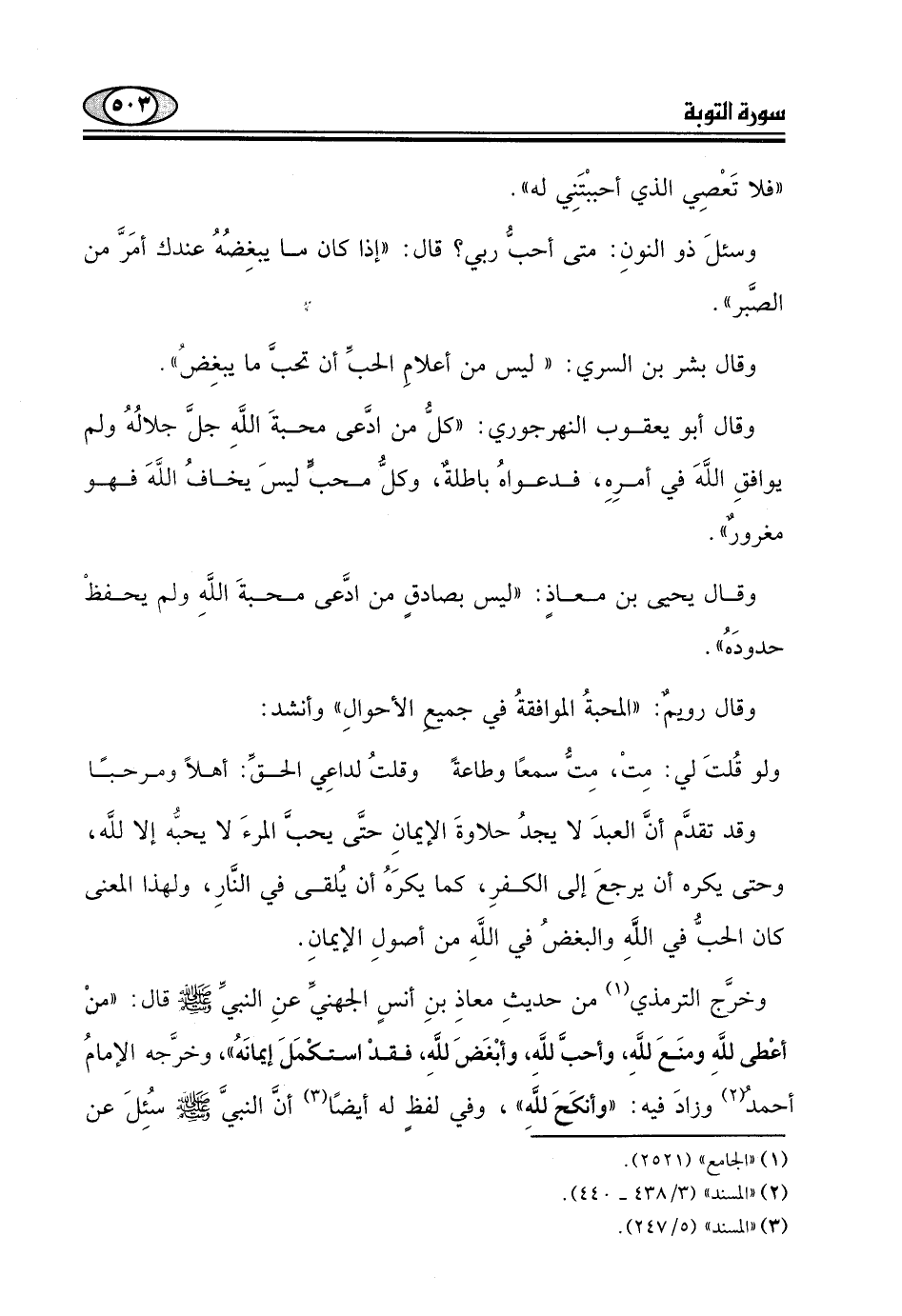 وقال بشر بن السري: " ليس من أعلامِ الحبِّ أن تحبَّ ما يبغِضُ".