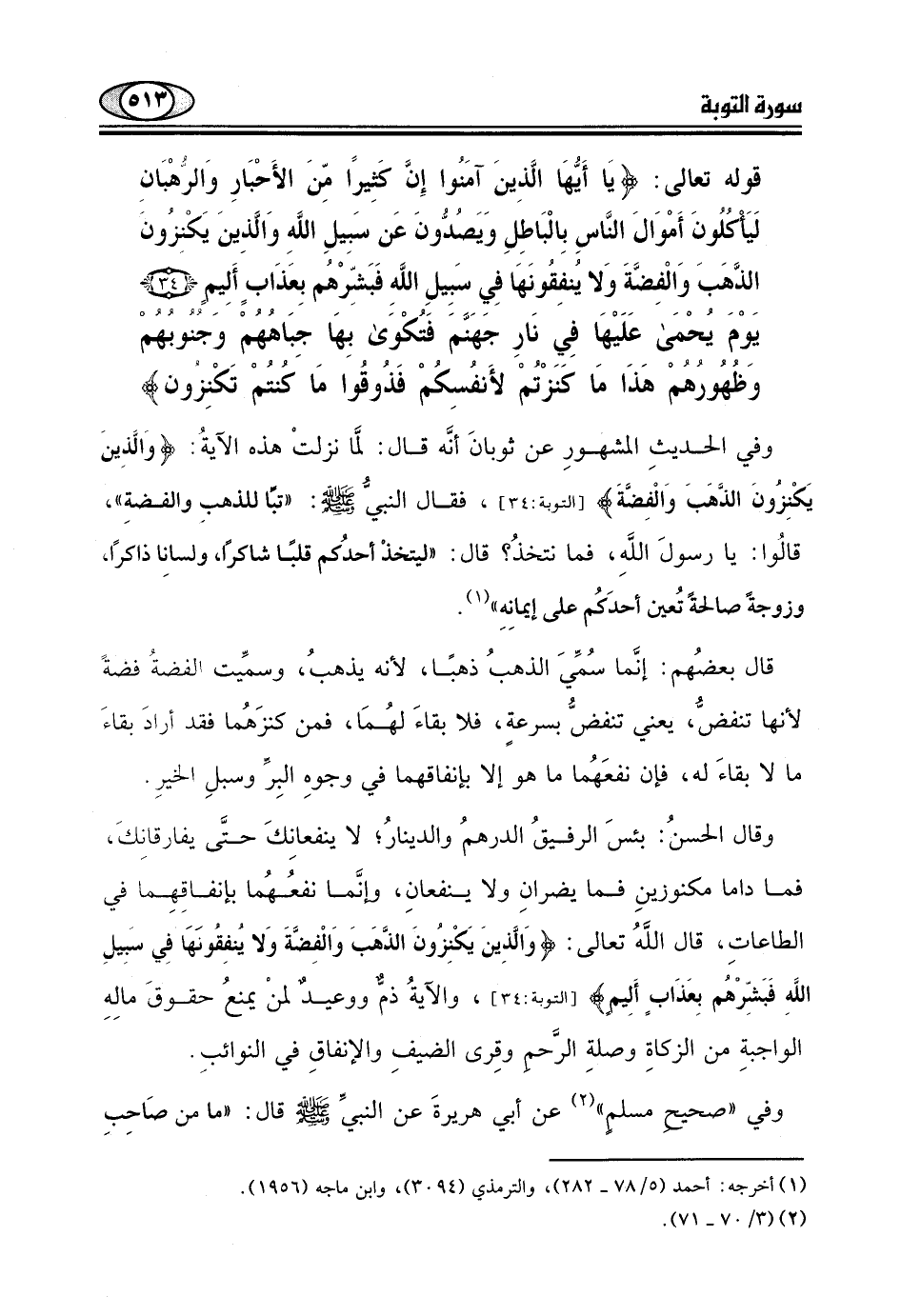 قوله تعالى: (يَا أَيُّهَا الَّذِينَ آمَنُوا إِنَّ كَثِيرًا مِنَ الْأَحْبَارِ وَالرُّهْبَانِ لَيَأْكُلُونَ أَمْوَالَ النَّاسِ بِالْبَاطِلِ وَيَصُدُّونَ عَنْ سَبِيلِ اللَّهِ وَالَّذِينَ يَكْنِزُونَ الذَّهَبَ وَالْفِضَّةَ وَلَا يُنْفِقُونَهَا فِي سَبِيلِ اللَّهِ فَبَشِّرْهُمْ بِعَذَابٍ أَلِيمٍ (34) يَوْمَ يُحْمَى عَلَيْهَا فِي نَارِ جَهَنَّمَ فَتُكْوَى بِهَا جِبَاهُهُمْ وَجُنُوبُهُمْ وَظُهُورُهُمْ هَذَا مَا كَنَزْتُمْ لِأَنْفُسِكُمْ فَذُوقُوا مَا كُنْتُمْ تَكْنِزُونَ (35)