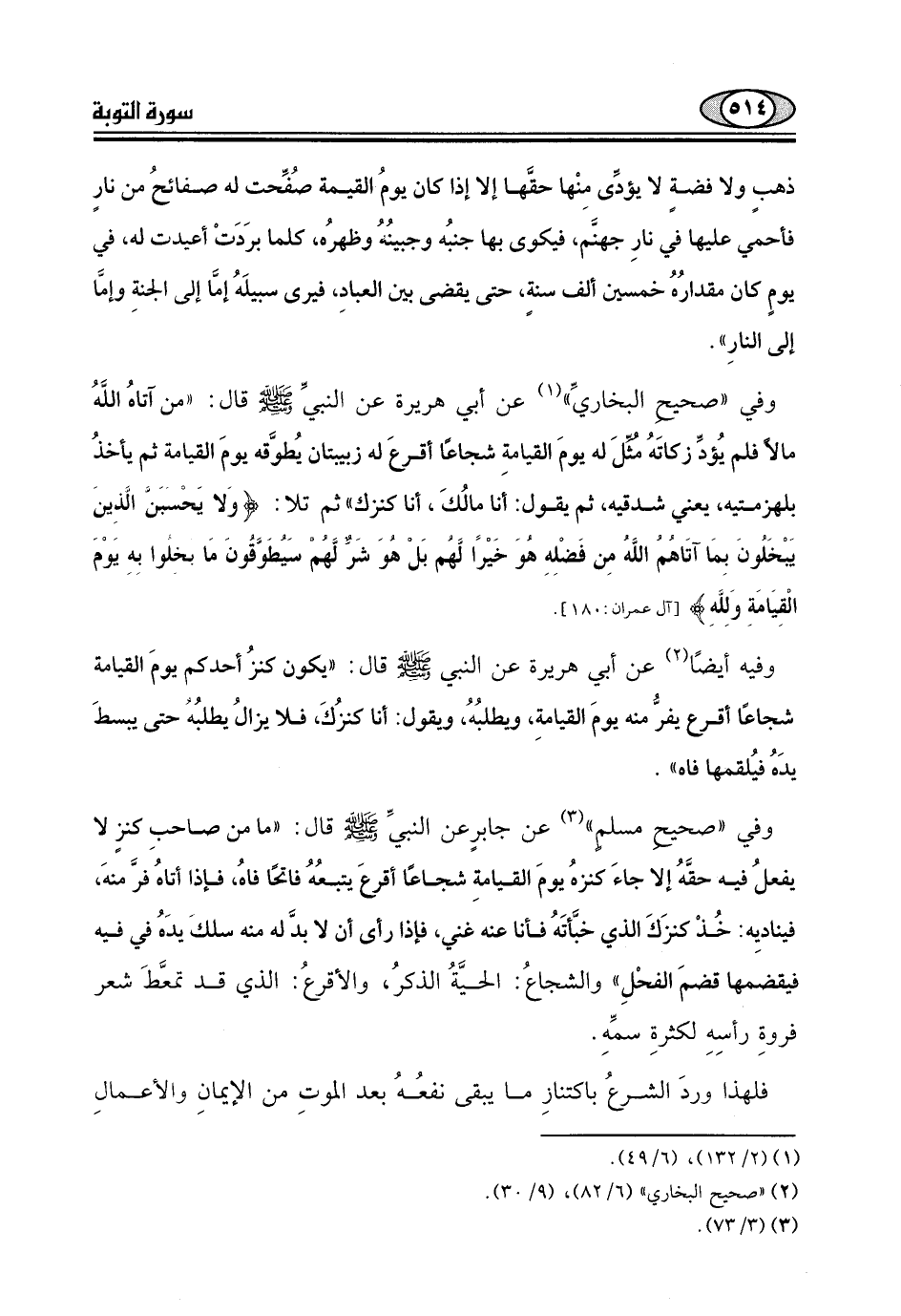 وفي "صحيح البخاريِّ " عن أبي هريرة عن النبيِّ - صلى الله عليه وسلم - قال: "من آتاهُ اللهُ مالاً فلم يُؤدِّ زكاتَهُ مُثلَ له يومَ القيامةِ شجاعًا أقرعَ له زبيبتان يُطوَّقه يومَ القيامة ثم يأخذُ بلهزمتيه، يعني شدقيه، ثم يقول: أنا مالُكَ، أنا كنزك " ثم تلا: (وَلَا يَحْسَبَنَّ الَّذِينَ يَبْخَلُونَ بِمَا آتَاهُمُ اللَّهُ مِنْ فَضْلِهِ هُوَ خَيْرًا لَهُمْ بَلْ هُوَ شَرٌّ لَهُمْ سَيُطَوَّقُونَ مَا بَخِلُوا بِهِ يَوْمَ الْقِيَامَةِ وَلِلَّهِ مِيرَاثُ السَّمَاوَاتِ وَالْأَرْضِ) .
