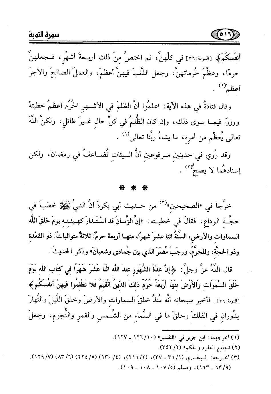 قال اللَّهُ عزَّ وجلَّ: (إِنَّ عِدَّةَ الشُّهُورِ عِنْدَ اللَّهِ اثْنَا عَشَرَ شَهْرًا فِي كِتَابِ اللَّهِ يَوْمَ خَلَقَ السَّمَاوَاتِ وَالْأَرْضَ مِنْهَا أَرْبَعَةٌ حُرُمٌ ذَلِكَ الدِّينُ الْقَيِّمُ فَلَا تَظْلِمُوا فِيهِنَّ أَنْفُسَكُمْ) .
