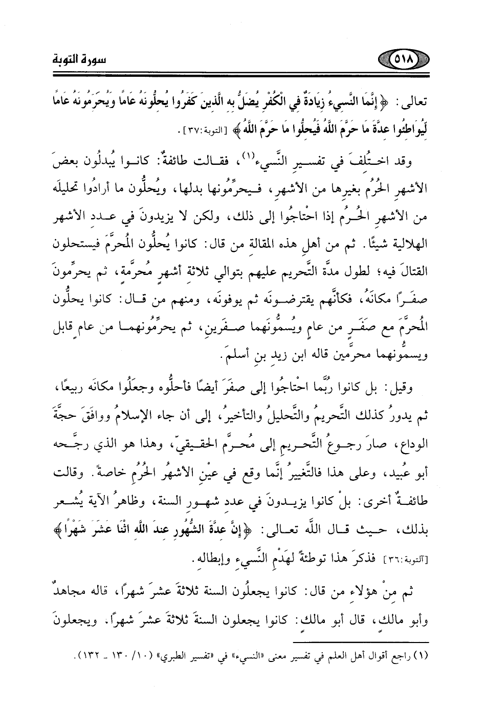 تعالى: (إِنَّمَا النَّسِيءُ زِيَادَةٌ فِي الْكُفْرِ يُضَلُّ بِهِ الَّذِينَ كَفَرُوا يُحِلُّونَهُ عَامًا وَيُحَرِّمُونَهُ عَامًا لِيُوَاطِئُوا عِدَّةَ مَا حَرَّمَ اللَّهُ فَيُحِلُّوا مَا حَرَّمَ اللَّهُ) .
