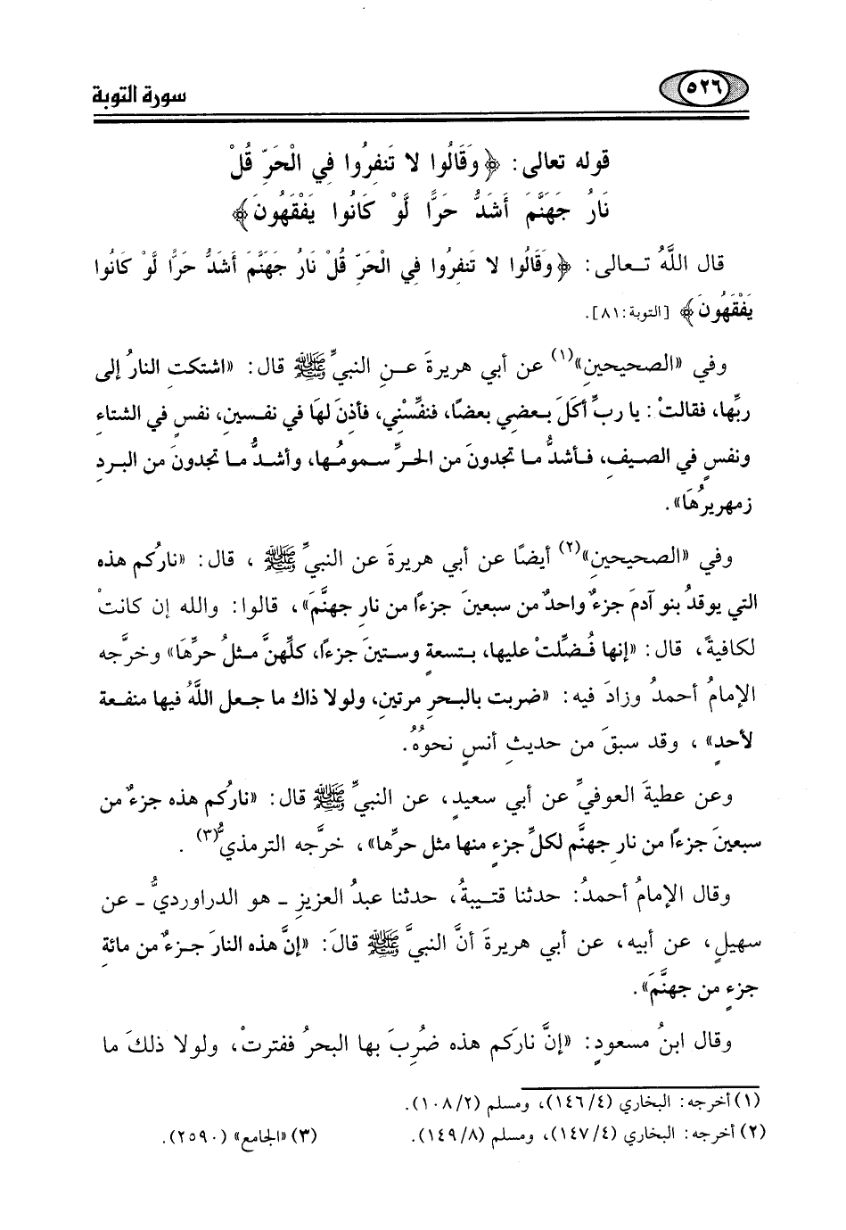 قال اللَّهُ تعالى: (وَقَالُوا لَا تَنْفِرُوا فِي الْحَرِّ قُلْ نَارُ جَهَنَّمَ أَشَدُّ حَرًّا لَوْ كَانُوا يَفْقَهُونَ (81) .