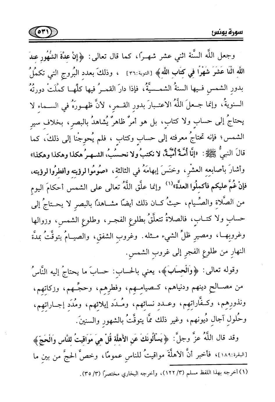 وإنما علَّق اللَهُ تعالى على الشمس أحكامَ اليومِ من الصَّلاةِ والصِّيام، حيثُ كان ذلك أيضًا مشاهدًا بالبصرِ لا يحتاجُ إلى حسابٍ ولا كتابٍ، فالصلاةُ تتعلَّقُ بطلوع الفجر، وطلوع الشمسِ، وزوالها وغروبِها، ومصيرِ ظلِّ الشيء مثله. وغروبِ الشفقِ، والصيامُ يتوقَّتُ بمدة النهارِ من طلوع الفجرِ إلى غروبِ الشمسِ.