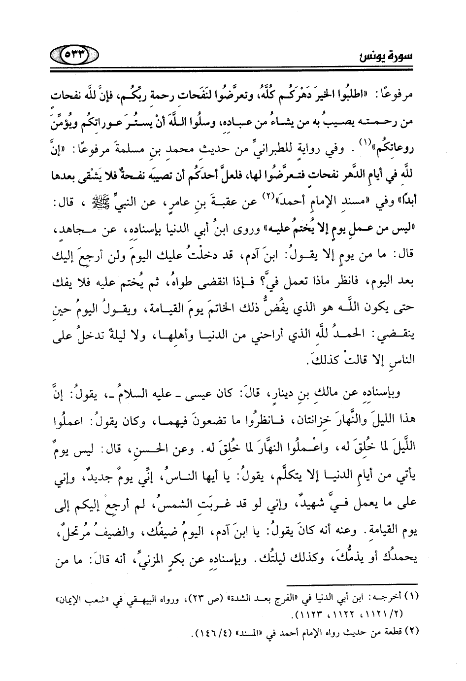 وفي "مسندِ الإمامِ أحمدَ" عن عقبةَ بنِ عامرٍ، عن النبيّ - صلى الله عليه وسلم -، قال: "ليس من عملِ يومِ إلا يُختمُ عليه "