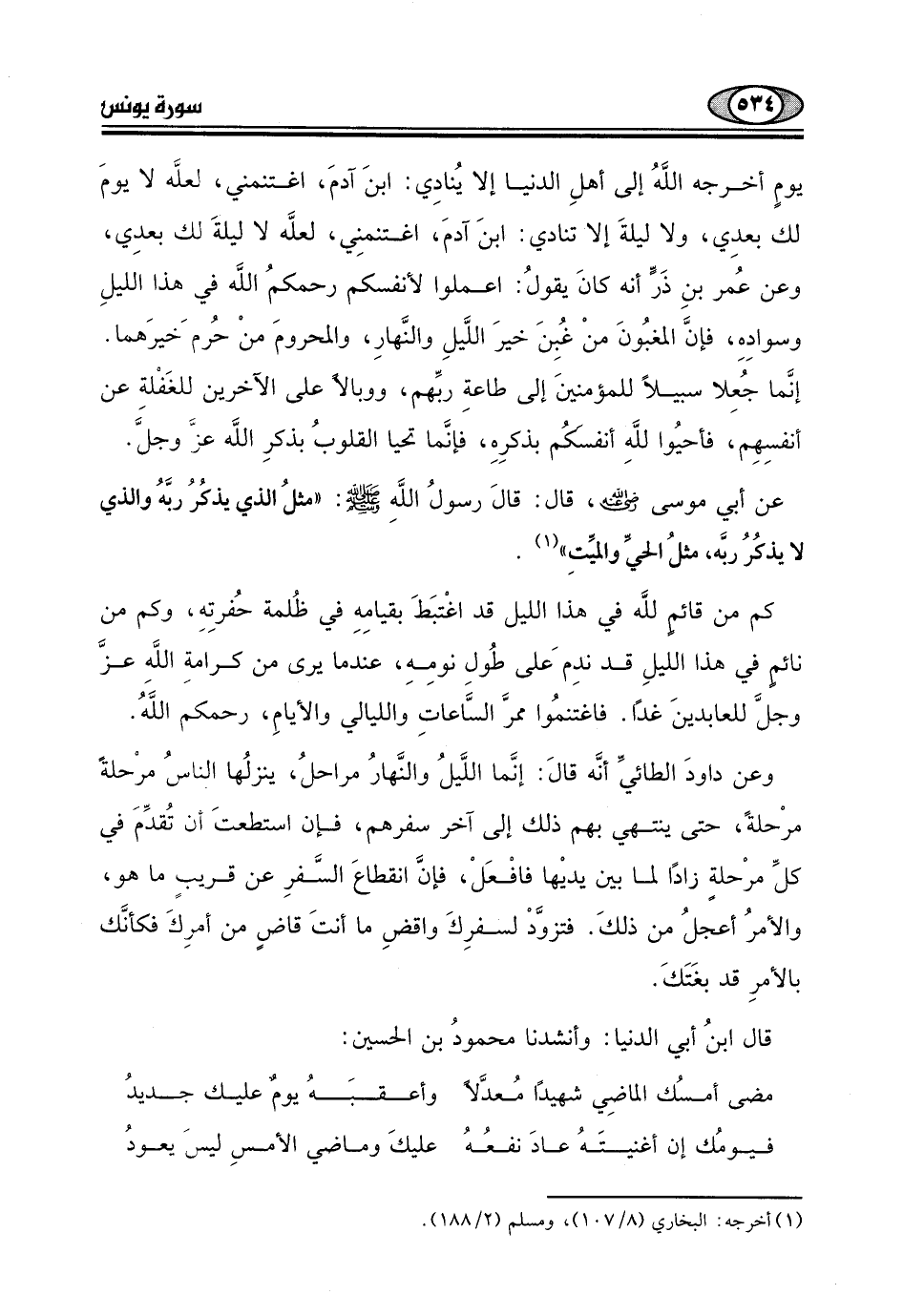 وعن داودَ الطائيِّ أنَّه قال: إنَّما اللَّيلُ والنَّهارُ مراحلُ، ينزلُها الناسُ مرْحلةً