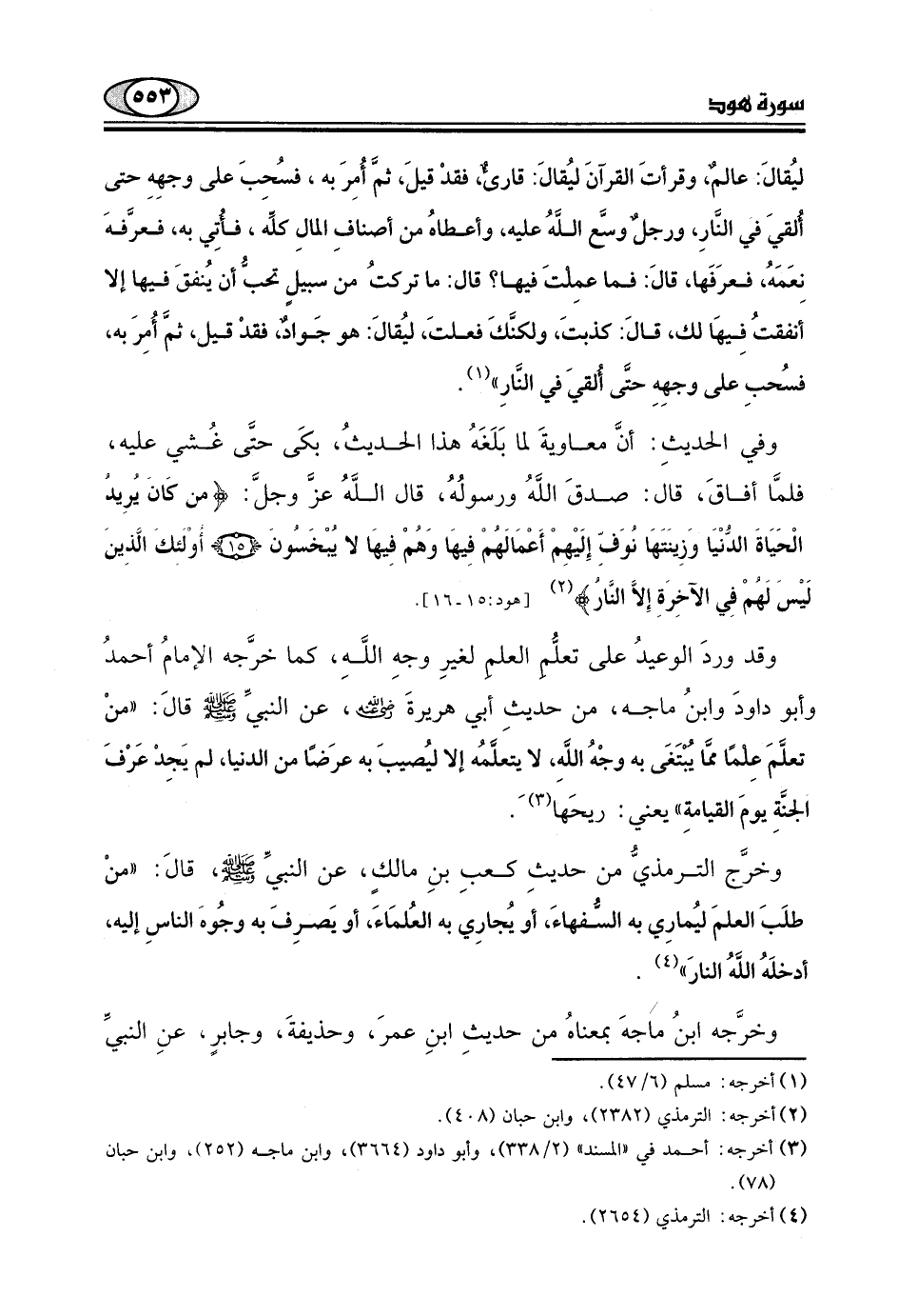 "منْ طلَبَ العلمَ ليُمارِي به السُّفهاءَ، أو يُجارِي به العُلمَاءَ، أو يَصرِفَ به وجُوهَ الناسِ إليه، أدخلَهُ اللَّهُ النارَ".