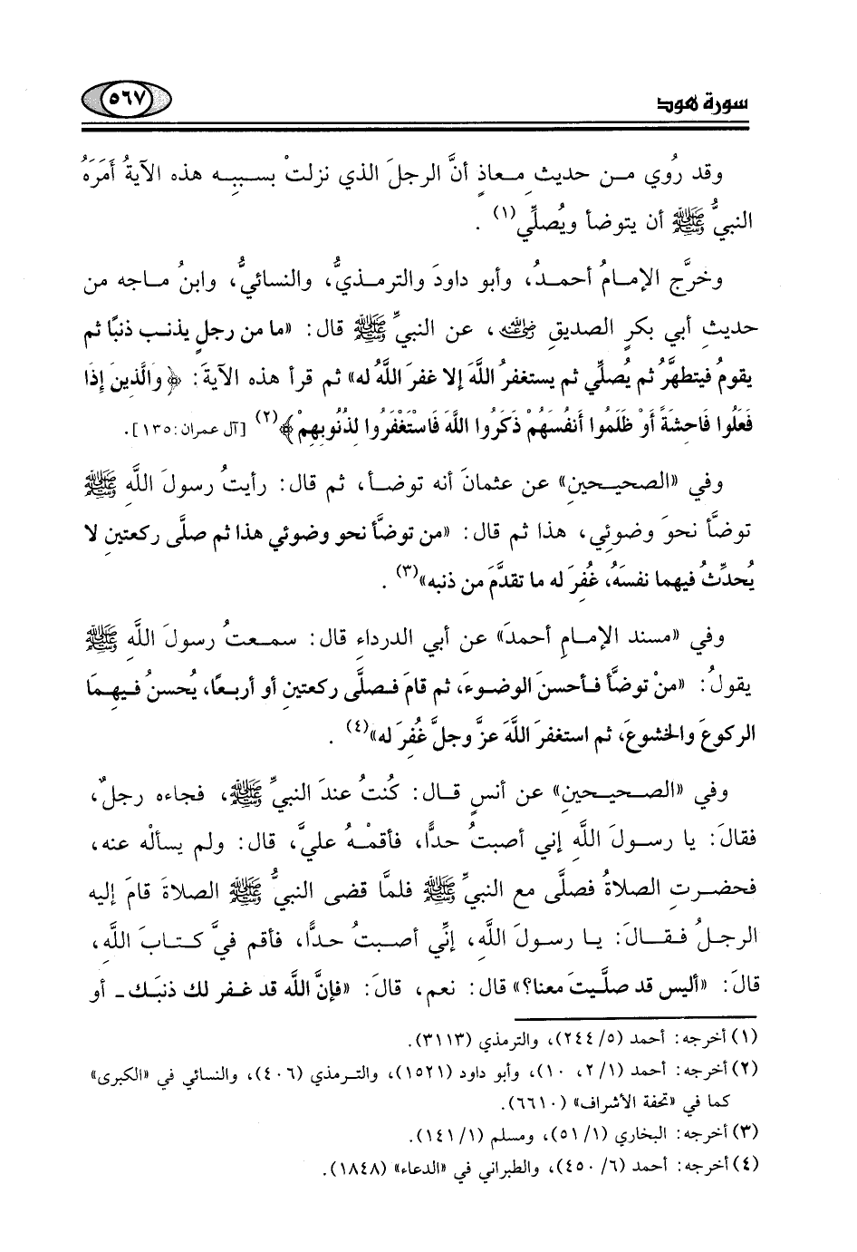 حديثِ أبي بكرٍ الصديقِ - رضي الله عنه -، عن النبيِّ - صلى الله عليه وسلم - قال: "ما من رجل يذنب ذنبًا ثم يقومُ فيتطهَّرُ ثم يُصلِّي ثم يستغفرُ اللَّهَ إلا غفرَ اللَّهُ له " ثم قرأ هذه الآيةَ: