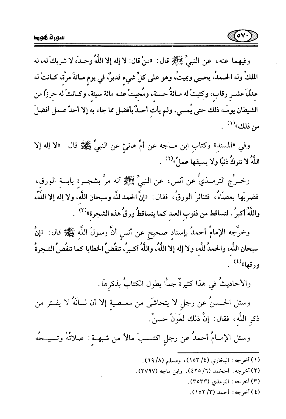 وفي "المسندِ" وكتابِ ابن ماجةَ عن أمِّ هانئ عن النبى - صلى الله عليه وسلم - قال. "لا إله إلا اللَّهُ لا تتركُ ذنبًا ولا يسبقها عملٌ ".
