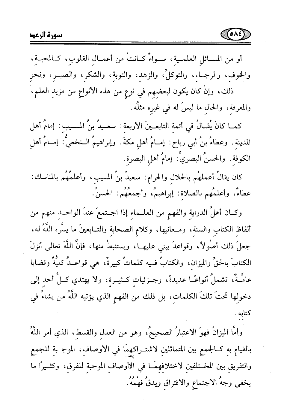 الكتابَ بالحقِّ والميزانِ، والكتابُ فيه كلمات كبيرة، هي قواعدُ كليُّة وقضايا عامَّة، تشملُ أنواعًا عديدةً، وجزئياتٍ كثيرةٍ، ولا يهتدي كلُّ أحد إلى دخولِها تحتَ تلكَ الكلماتِ، بل ذلك من الفهم الذي يؤتيه اللَّهُ من يشاءُ في كتابِهِ.