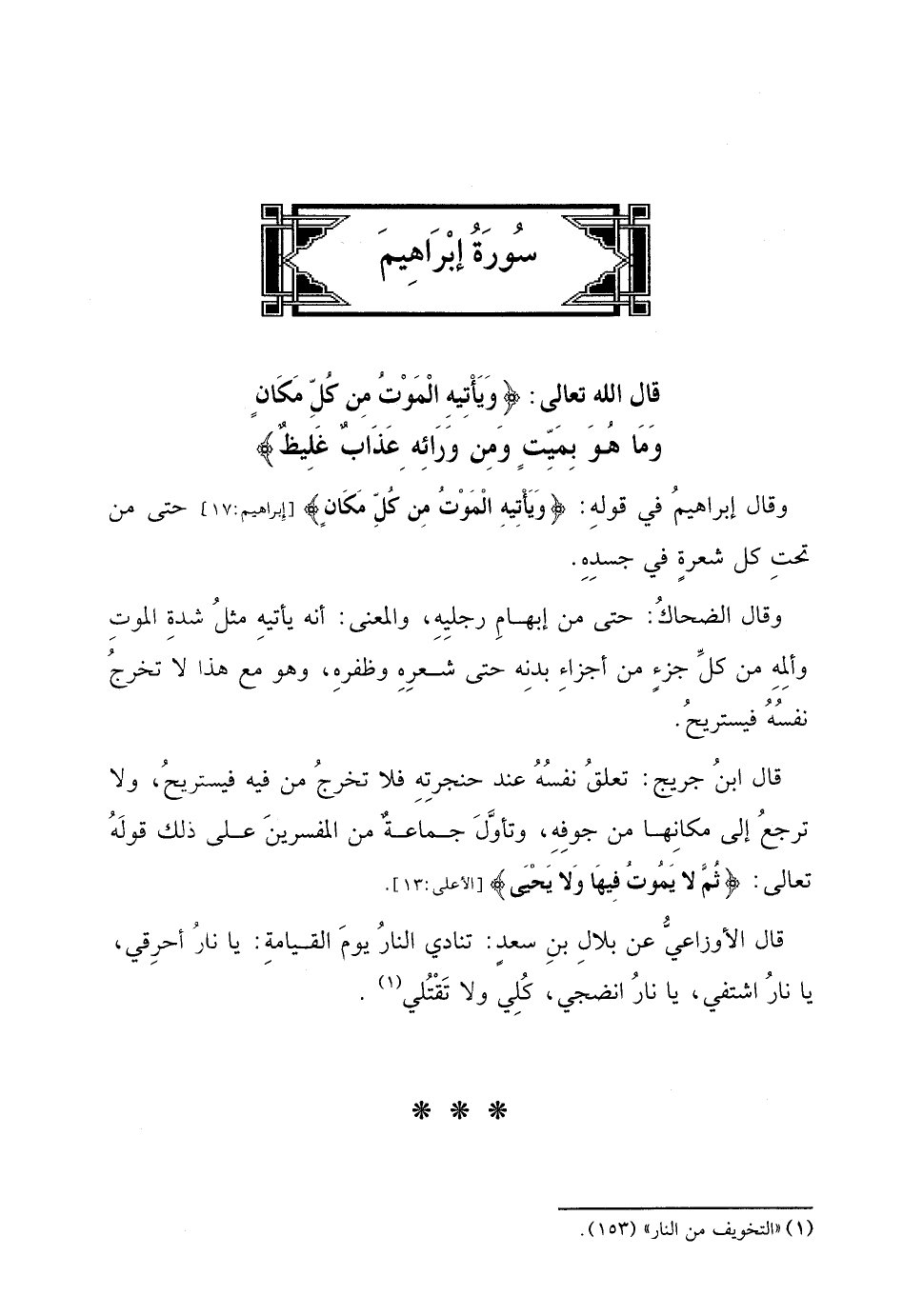 قال الله تعالى: (وَيَأْتِيهِ الْمَوْتُ مِنْ كُلِّ مَكَانٍ وَمَا هُوَ بِمَيِّتٍ وَمِنْ وَرَائِهِ عَذَابٌ غَلِيظٌ (17)