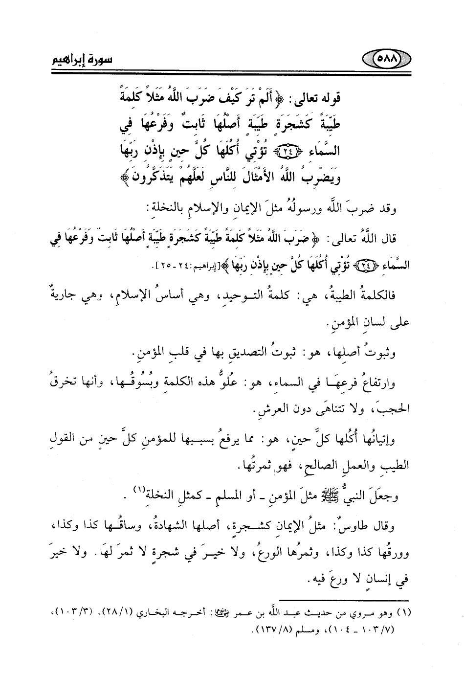 قوله تعالى: (أَلَمْ تَرَ كَيْفَ ضَرَبَ اللَّهُ مَثَلًا كَلِمَةً طَيِّبَةً كَشَجَرَةٍ طَيِّبَةٍ أَصْلُهَا ثَابِتٌ وَفَرْعُهَا فِي السَّمَاءِ (24) تُؤْتِي أُكُلَهَا كُلَّ حِينٍ بِإِذْنِ رَبِّهَا وَيَضْرِبُ اللَّهُ الْأَمْثَالَ لِلنَّاسِ لَعَلَّهُمْ يَتَذَكَّرُونَ (25)