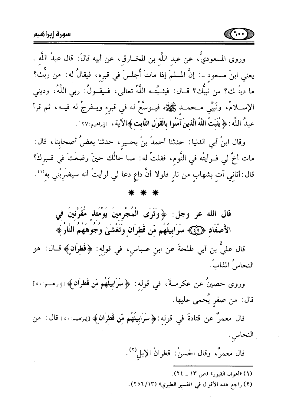 قال معمرٌ عن قتادةَ في قولِهِ: (سَرَابِيلُهُمْ مِنْ قَطِرَانٍ) قال: من النحاسِ.