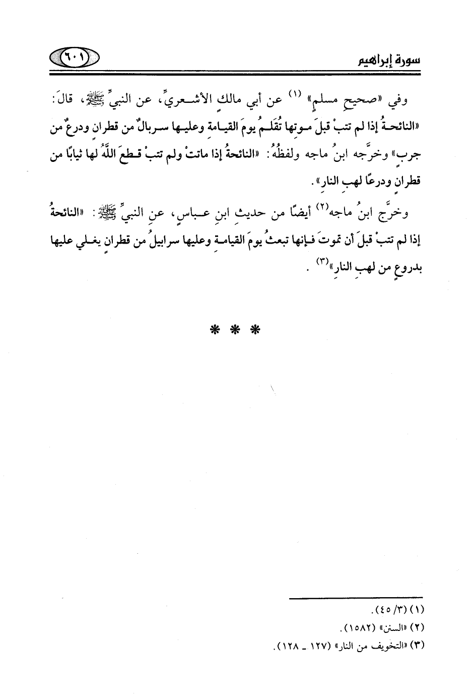 "النَّائِحَةُ إِذَا لَمْ تَتُبْ قَبْلَ مَوْتِهَا تُقَامُ يَوْمَ الْقِيَامَةِ وَعَلَيْهَا سِرْبَالٌ مِنْ قَطِرَانٍ وَدِرْعٌ مِنْ جَرَبٍ "