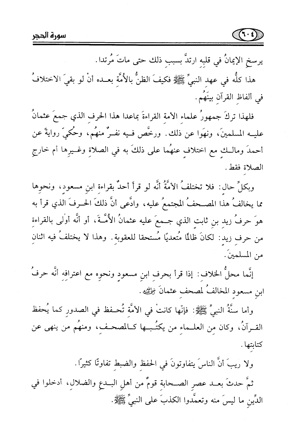 هذا كلُّه في عهدِ النبيِّ - صلى الله عليه وسلم - فكيفَ الظنُّ بالأُمَّةِ بعده أنْ لو بقيَ الاختلافُ في ألفاظِ القرآنِ بينَهُم.