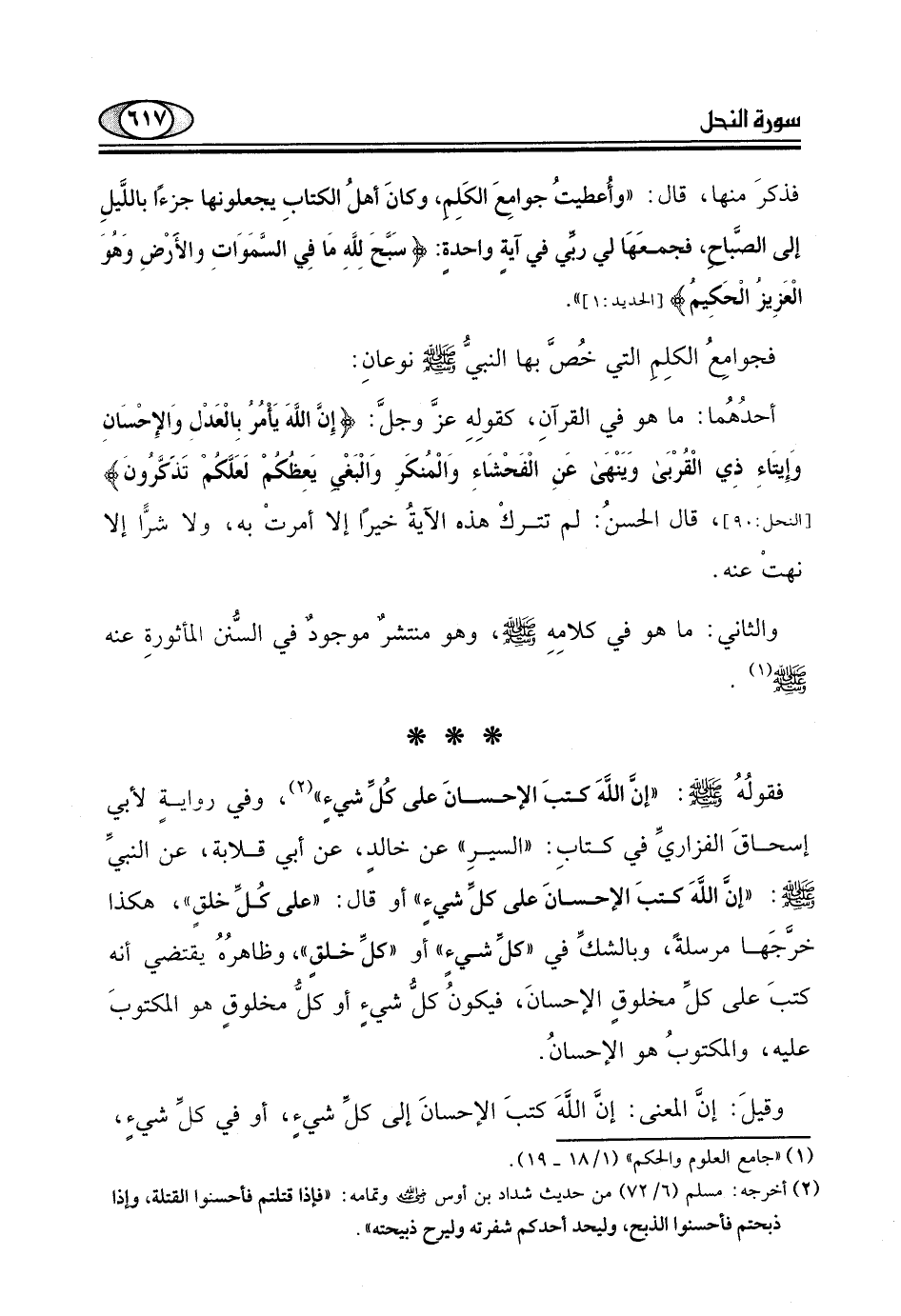 فقولُهُ - صلى الله عليه وسلم -: "إنَّ اللَهَ كتبَ الإحسانَ على كُلِّ شيءِ"، وفي روايةٍ لأبي إسحاقَ الفزاريِّ في كتابِ: "السيرِ" عن خالدٍ، عن أبي قلابة، عن النبيِّ - صلى الله عليه وسلم -:
