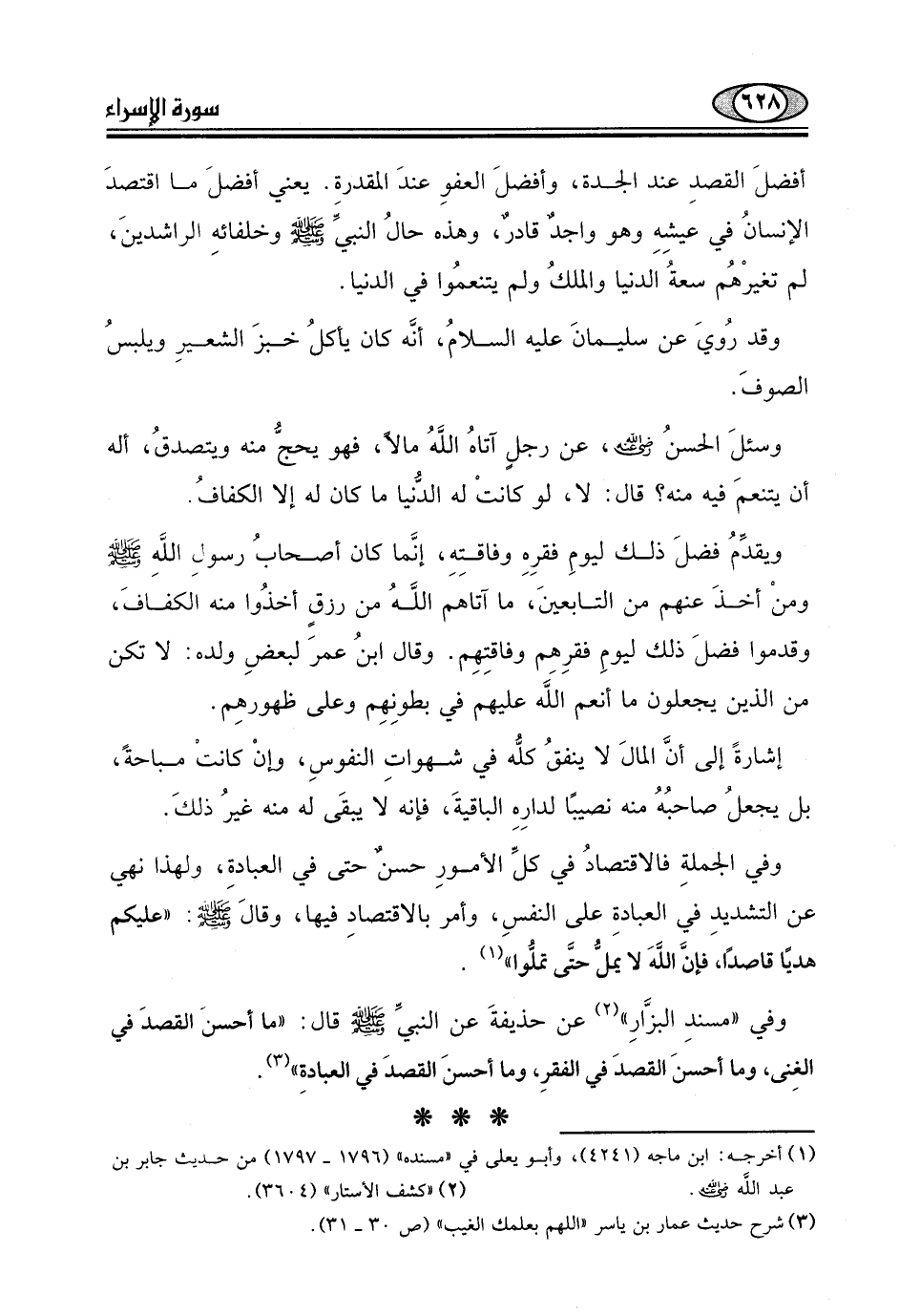 وفي "مسندِ البزَّارِ" عن حذيفةَ عن النبيِّ - صلى الله عليه وسلم - قال: "ما أحسنَ القصدَ في الغِنى، وما أحسنَ القصدَ في الفقرِ، وما أحسنَ القصدَ في العبادةِ".
