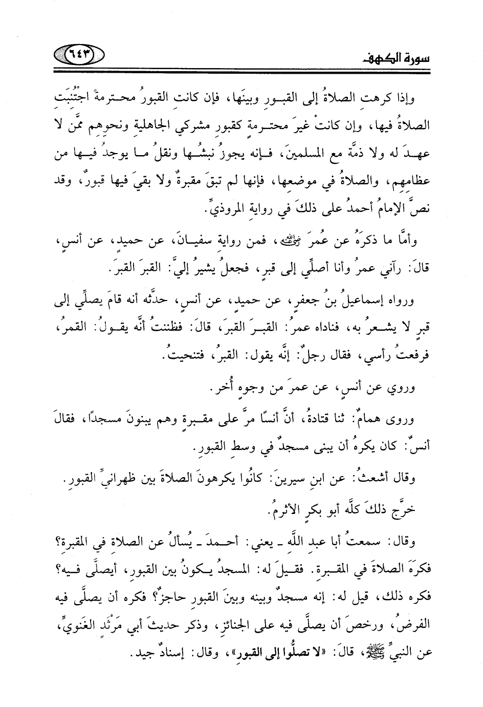 أنسٌ: كان يكرهُ أن يبنى مسجدٌ في وسطِ القبورِ.