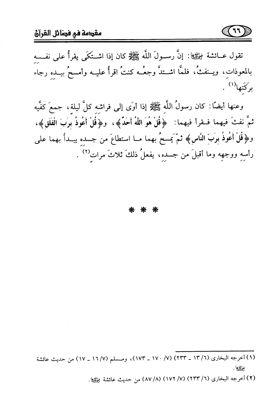وعنها أيضًا: كان رسولُ اللَّهِ - صلى الله عليه وسلم - إذا أوَى إلى فراشِهِ كلَّ ليلة، جمعَ كفَّيه ثمَّ نفثَ فيهما فقرأ فيهما: (قُلْ هُوَ اللَّهُ أَحَدٌ) .