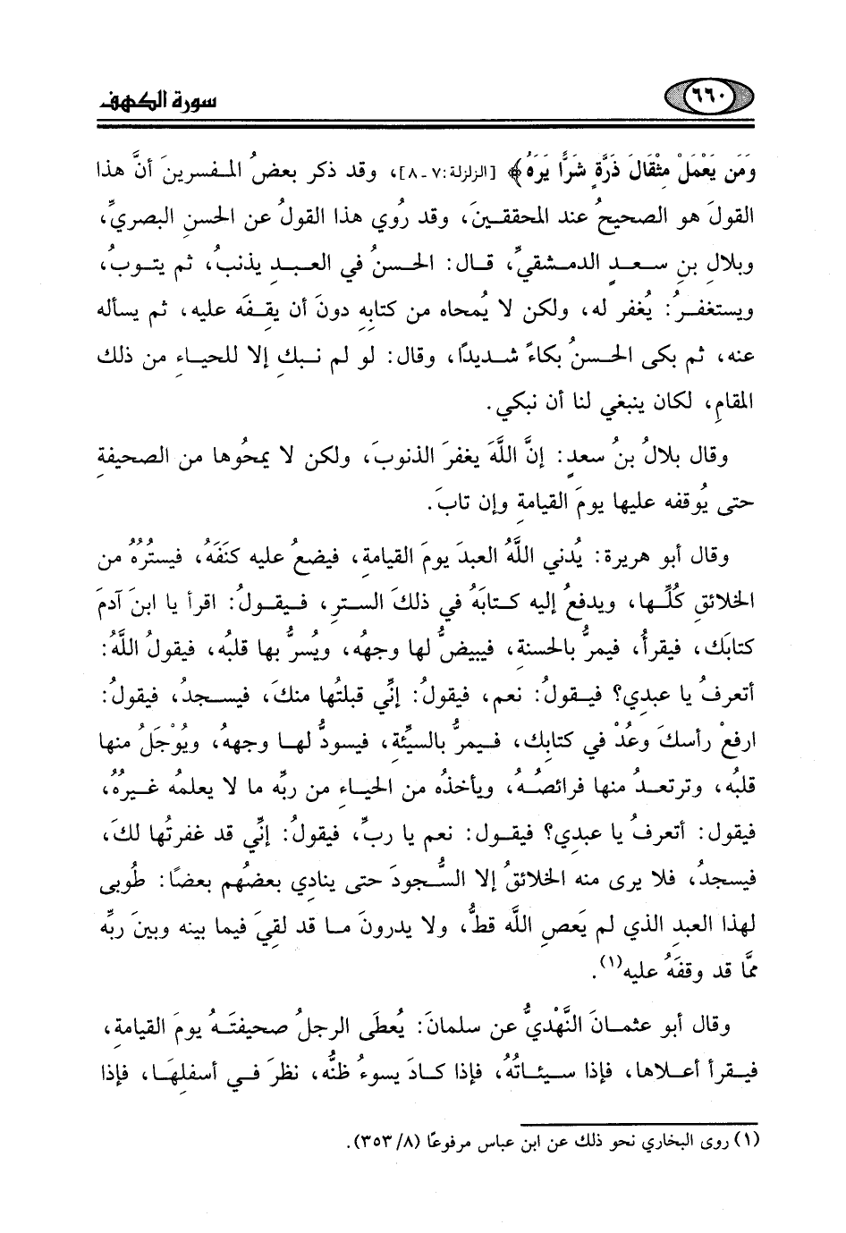 وقال أبو عثمانَ النَّهْديُّ عن سلمانَ: يُعطَى الرجلُ صحيفتَهُ يومَ القيامةِ.