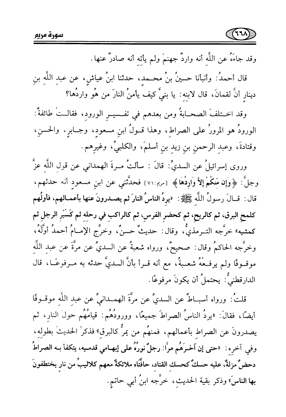 أيضًا، فقالَ: "يردُ الناسُ الصراطَ جميعًا، وورودُهُم: قيامُهُم حولَ النارِ، ثم