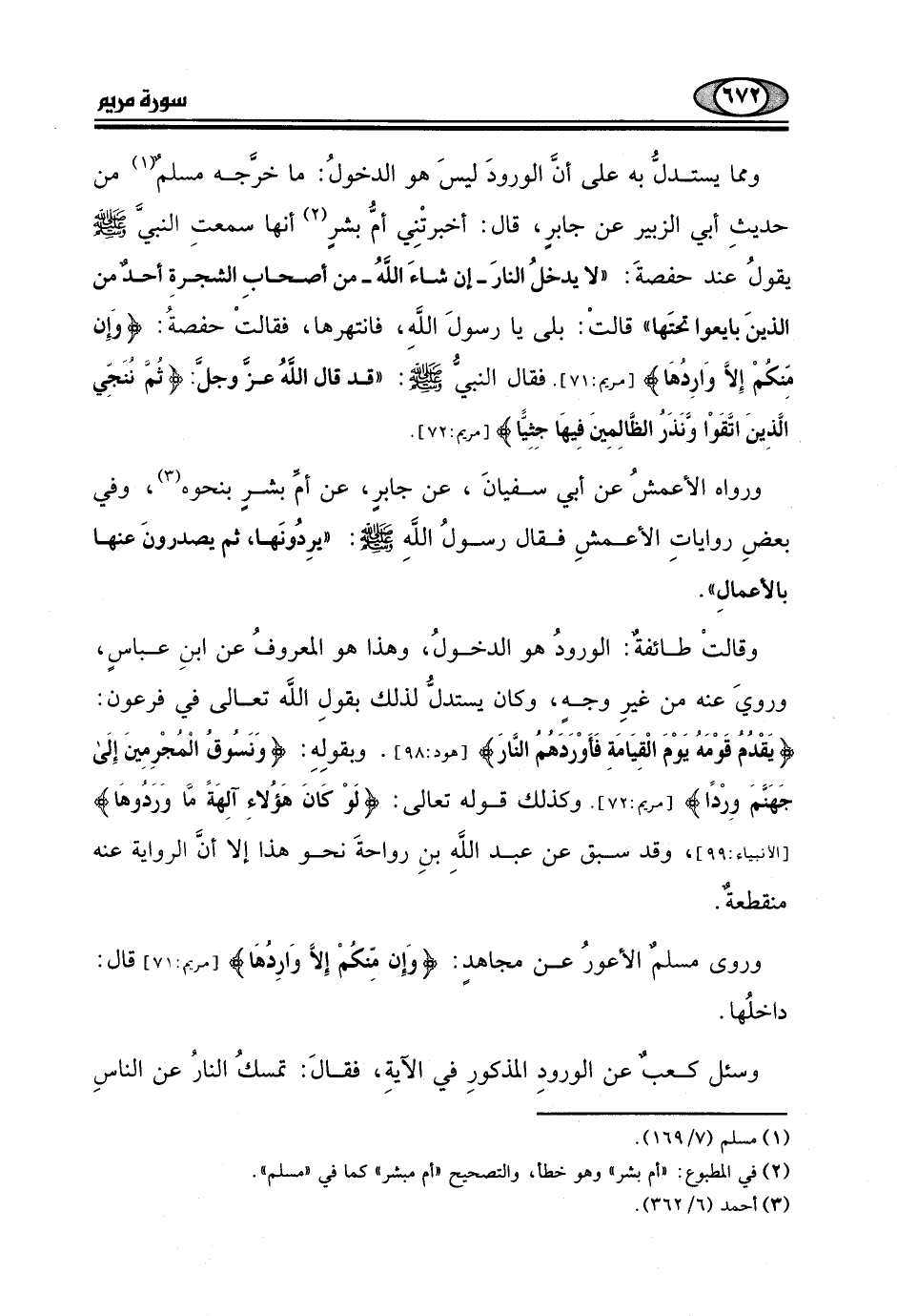 وسئل كعبٌ عن الورودِ المذكورِ في الآيةِ، فقالَ: تمسكُ النارُ عن الناسِ
