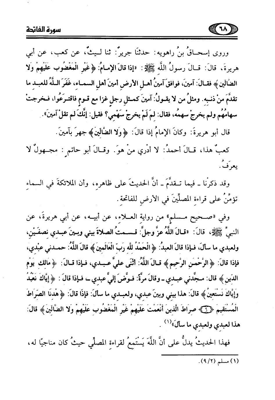 النبيِّ - صلى الله عليه وسلم -، قالَ: "قالَ اللَهُ عزَّ وجل قسمتُ الصلاةَ بيني وبينَ عبدِي نِصفَيْنِ، ولعبدي ما سألَ، فإذا قالَ العبدُ: (الْحَمْدُ لِلَّهِ رَبِّ الْعَالَمِينَ) قالَ اللَهُ: حمدني عبْدِي، فإذا قالَ: (الرَّحْمَنِ الرَّحِيمِ) قالَ اللَّهُ: أثْنَى علي عبدي، فإذا قالَ: (مَالِكِ يَوْمِ الدِّينِ) قال: مجَّدني عبدِي - وقالَ مرة: فوَّضَ إليَّ عبدِي فإذا قالَ: (إِيَّاكَ نَعْبُدُ وَإِيَّاكَ نَسْتَعِينُ) قالَ: هذا بينِي وبينَ عبدِي، ولعبدِي ما سألَ: فإذَا قالَ: (اهْدِنَا الصِّرَاطَ الْمُسْتَقِيمَ (6) صِرَاطَ الَّذِينَ أَنْعَمْتَ عَلَيْهِمْ غَيْرِ الْمَغْضُوبِ عَلَيْهِمْ وَلَا الضَّالِّينَ)