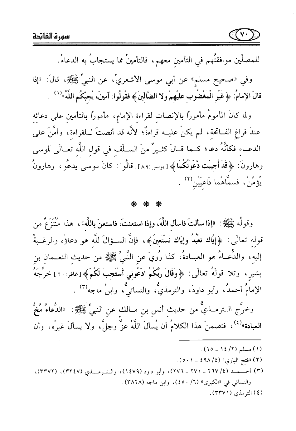 وقولُه - صلى الله عليه وسلم -: "إذا سألتَ فاسألِ اللَهَ، وإذا استعنتَ، فاستعنْ باللَّهِ "، هذا منْتَزعٌ من قولِهِ تعالَى: (إِيَّاكَ نَعْبُدُ وَإِيَّاكَ نَسْتَعِينُ) ، فإنَّ السؤالَ للهِ هو دعاؤه والرغبةُ