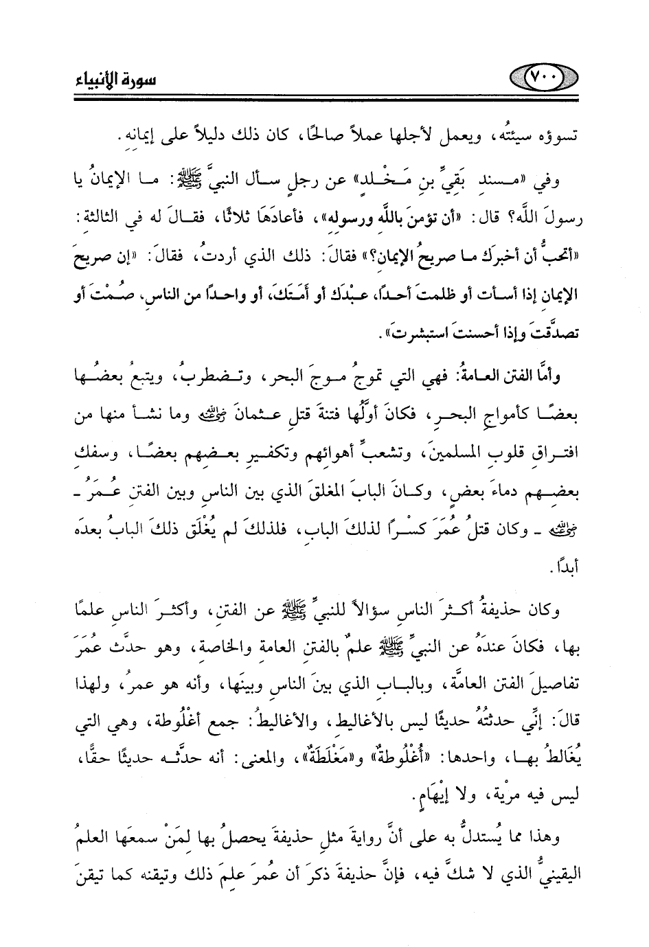 وكان حذيفةُ أكثرَ الناسِ سؤالا للنبيِّ - صلى الله عليه وسلم - عن الفتنِ، وأكثرَ الناسِ علمًا بها، فكانَ عندَهُ عن النبي - صلى الله عليه وسلم - علمٌ بالفتنِ العامةِ والخاصةِ، وهو حدَّث عُمَرَ تفاصيلَ الفتن العامَّة، وبالبابِ الذي بينَ الناسِ وبينَها، وأنه هو عمرُ، ولهذا قالَ: إنِّي حدثتُهُ حديثًا ليس بالأغاليطِ، والأغاليطُ: جمع أغْلُوطة، وهي التي يُغَالطُ بها.
