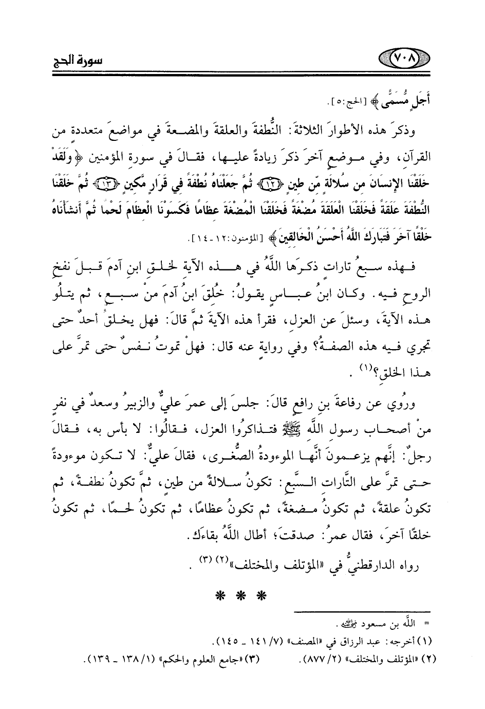 وذكرَ هذه الأطوارَ الثلاثةَ: النُّطفةَ والعلقةَ والمضعةَ في مواضعَ متعددةٍ من