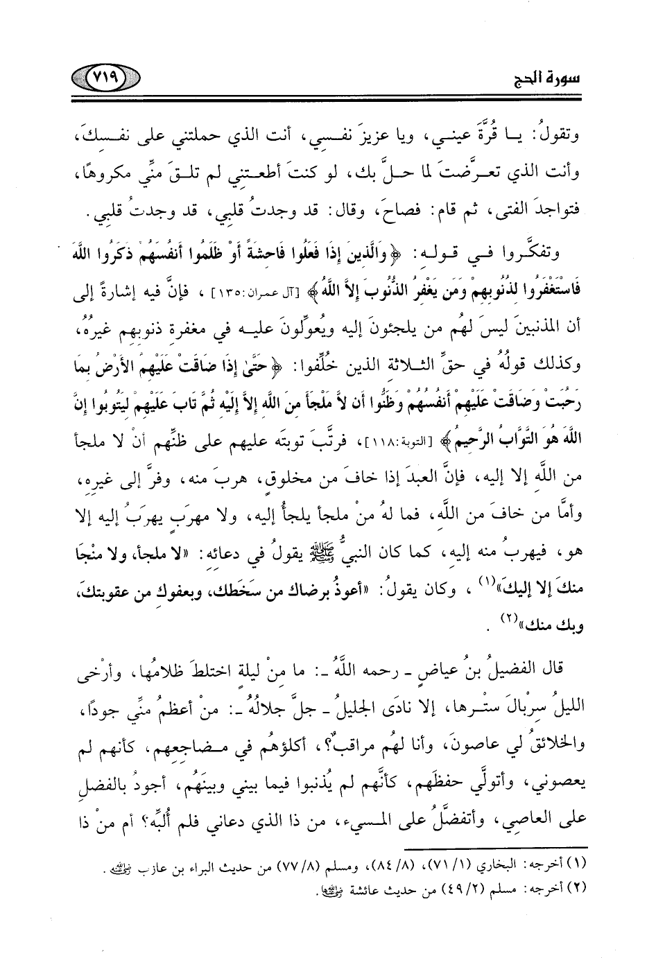 هو، فيهربُ منه إليهِ، كما كان النبيُّ - صلى الله عليه وسلم - يقولُ في دعائِهِ: "لا ملجأ، ولا منْجَا منكَ إلا إليكَ "، وكان يقولُ: "أعوذُ برضاك من سَخَطك، وبعفوك من عقوبتكَ، وبك منك ".