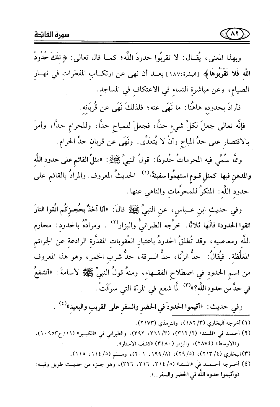 "أنا آخذٌ بحُجزِكم اتَّقوا النارَ اتقوا الحدود" قالَها ثلاثاً". خرَّجه الطبرانيُّ والبزار. ومرادُهُ بالحدودِ: محارم اللَّه ومعاصيهِ، وقد تُطلقُ الحدودُ باعتبارِ العُقوباتِ المقدَّرةِ الرادعةِ عن الجرائم المغَلَّظةِ. فيُقالُ: حدُّ الزِّنا، حدُّ السرقة، حدُّ شربِ الخمر، وهو هذا المعروف من اسم الحدودِ في اصطلاح الفقهاءِ، ومنهُ قولُ النبيِّ - صلى الله عليه وسلم - لأسامةَ: