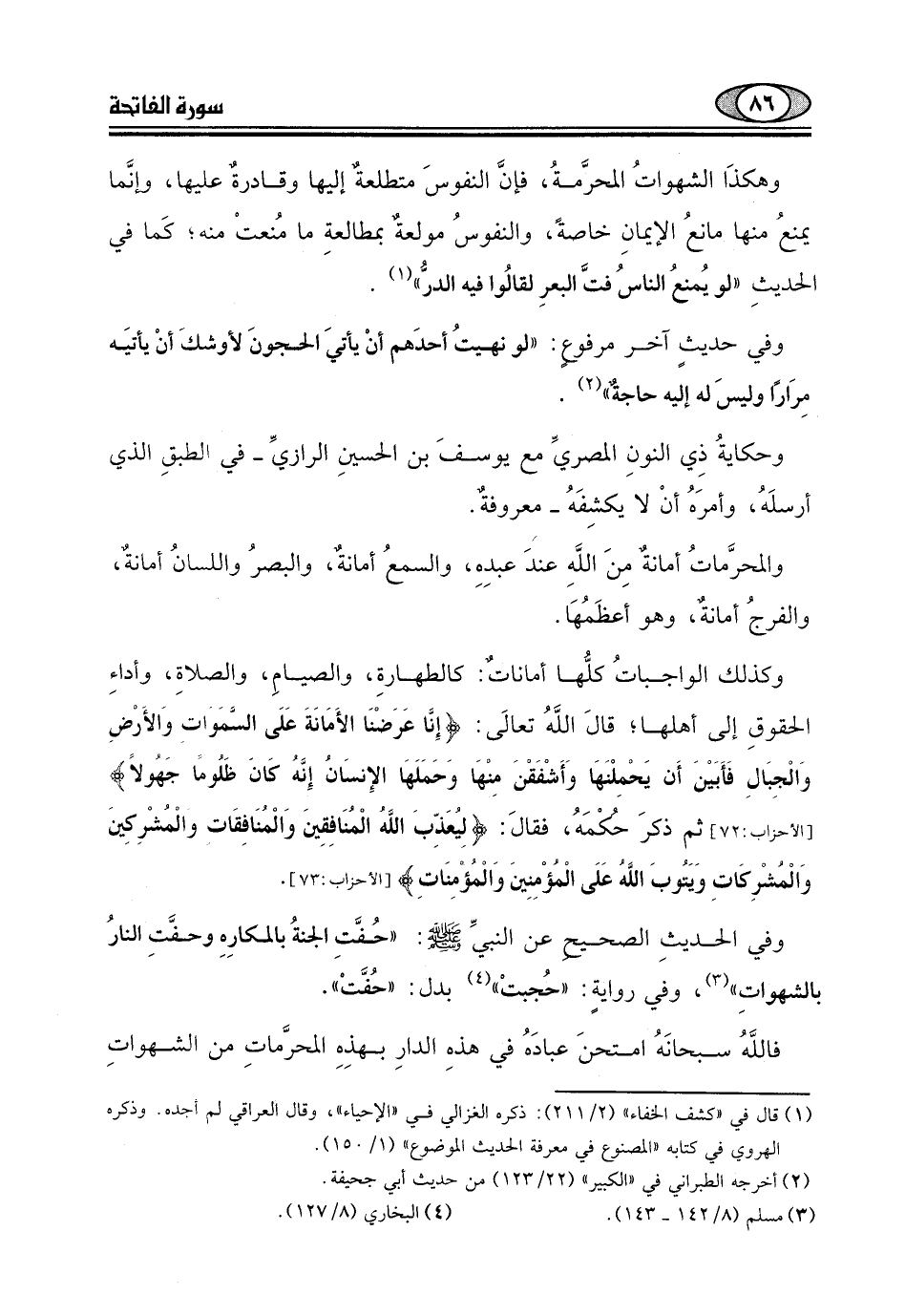 والمحرَّماتُ أمانةٌ مِنَ اللَّهِ عندً عبدِهِ، والسمعُ أمانةٌ، والبصرُ واللسانُ أمانةٌ.