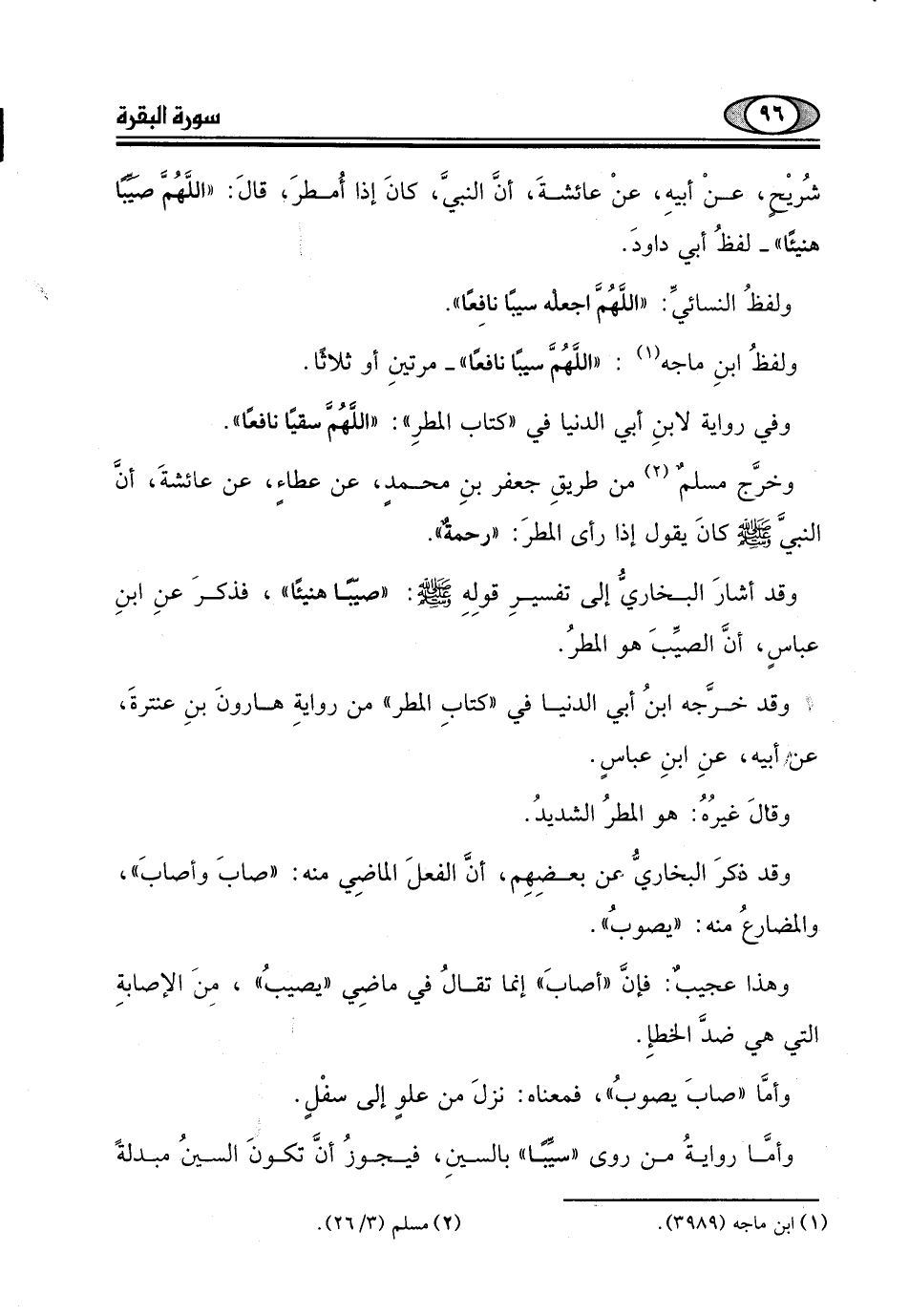 وقد أشارَ البخاريُّ إلى تفسيرِ قولِهِ - صلى الله عليه وسلم -: "صيبا هنيئًا"، فذكرَ عنِ ابنِ عباسٍ، أنَّ الصيِّبَ هو المطرُ.