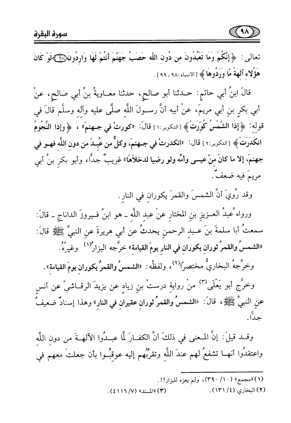 وقد رُويَ أنَّ الشمسَ والقمرَ يكورانِ في النارِ.