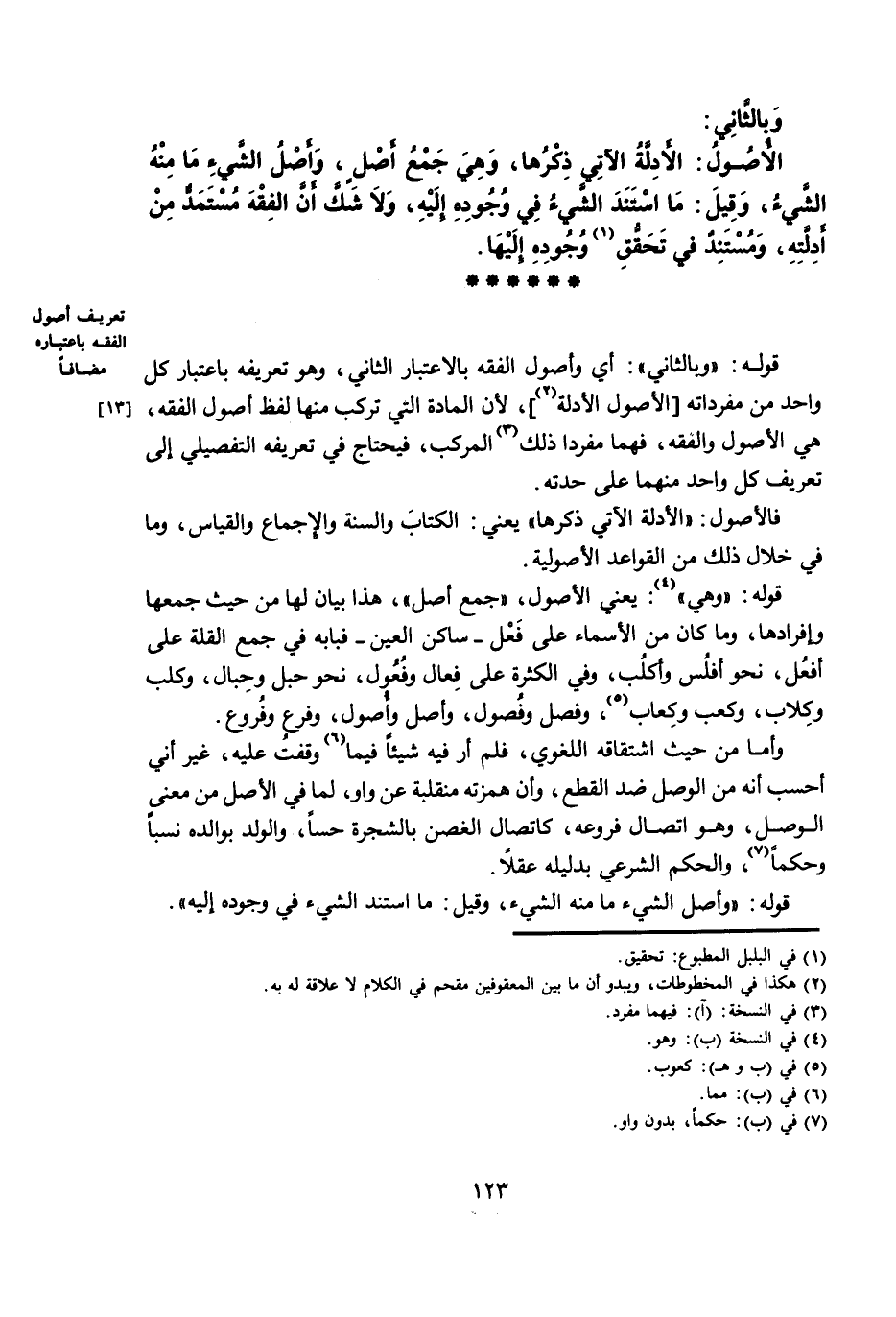 قَوْلُهُ: «وَبِالثَّانِي» : أَيْ وَأُصُولُ الْفِقْهِ بِالِاعْتِبَارِ الثَّانِي، وَهُوَ تَعْرِيفُهُ بِاعْتِبَارِ كُلِّ وَاحِدٍ مِنْ مُفْرَدَاتِهِ [الْأُصُولُ الْأَدِلَّةُ] ، لِأَنَّ الْمَادَّةَ الَّتِي تَرَكَّبَ مِنْهَا لَفْظُ أُصُولِ الْفِقْهِ، هِيَ الْأُصُولُ وَالْفِقْهُ، فَهُمَا مُفْرَدَا ذَلِكَ الْمُرَكَّبِ، فَيَحْتَاجُ فِي تَعْرِيفِهِ التَّفْصِيلِيِّ إِلَى تَعْرِيفِ كُلِّ وَاحِدٍ مِنْهُمَا عَلَى حِدَّتِهِ.