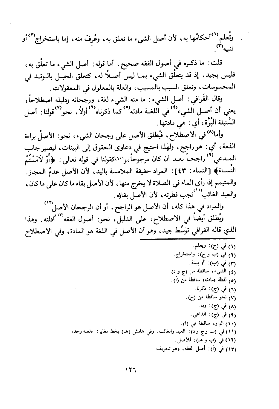 وَقَالَ الْقَرَافِيُّ: أَصْلُ الشَّيْءِ: مَا مِنْهُ الشَّيْءُ لُغَةً، وَرُجْحَانُهُ وَدَلِيلُهُ اصْطِلَاحًا، يَعْنِي أَنَّ أَصْلَ الشَّيْءِ فِي اللُّغَةِ مَادَّتُهُ كَمَا ذَكَرْنَاهُ أَوَّلًا، نَحْوَ قَوْلِنَا: أَصْلُ السُّنْبُلَةِ الْبُرَّةُ، أَيْ: هِيَ مَادَّتُهَا.