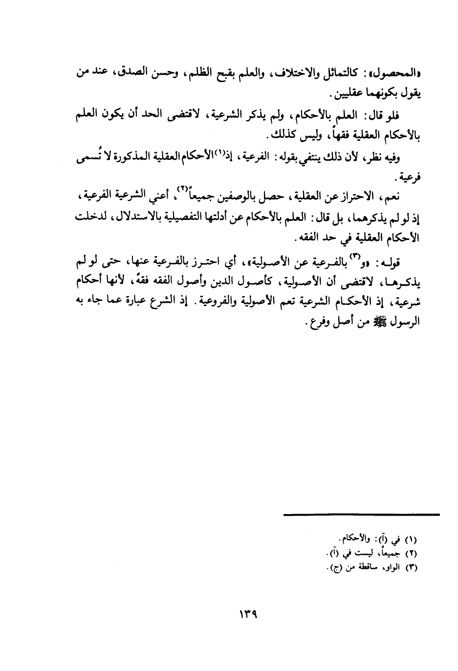 وَفِيهِ نَظَرٌ، لِأَنَّ ذَلِكَ يَنْتَفِي بِقَوْلِهِ: الْفَرْعِيَّةِ، إِذِ الْأَحْكَامُ الْعَقْلِيَّةُ الْمَذْكُورَةُ لَا تُسَمَّى فَرْعِيَّةً.