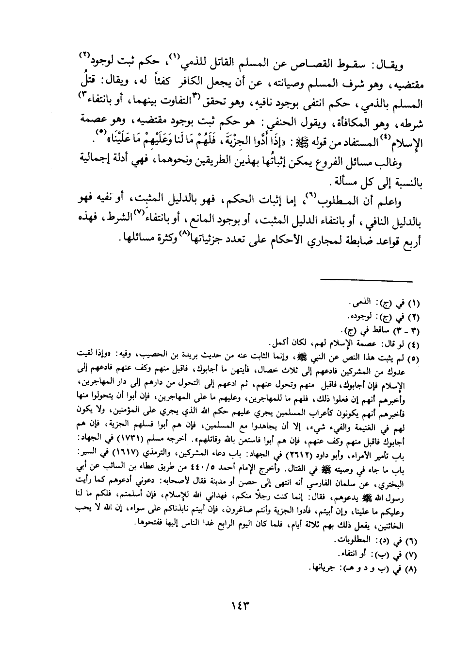 وَيُقَالُ: سُقُوطُ الْقَصَاصِ عَنِ الْمُسْلِمِ الْقَاتِلِ لِلذِّمِّيِّ، حُكْمٌ ثَبَتَ لِوُجُودِ مُقْتَضِيهِ، وَهُوَ شَرَفُ الْمُسْلِمِ وَصِيَانَتُهُ، عَنْ أَنْ يُجْعَلَ الْكَافِرُ كُفْئًا لَهُ، وَيُقَالَ: قَتْلُ الْمُسْلِمِ بِالذِّمِّيِّ، حُكْمٌ انْتَفَى بِوُجُودِ نَافِيهِ، وَهُوَ تَحَقُّقُ التَّفَاوُتِ بَيْنَهُمَا، أَوْ بِانْتِفَاءِ شَرْطِهِ، وَهُوَ الْمُكَافَأَةُ، وَيَقُولُ الْحَنَفِيُّ: هُوَ حُكْمٌ ثَبَتَ بِوُجُودِ مُقْتَضِيهِ، وَهُوَ عِصْمَةُ الْإِسْلَامِ الْمُسْتَفَادُ مِنْ قَوْلِهِ صَلَّى اللَّهُ عَلَيْهِ وَسَلَّمَ: إِذَا أَدَّوُا الْجِزْيَةَ، فَلَهُمْ مَا لَنَا وَعَلَيْهِمْ مَا عَلَيْنَا.