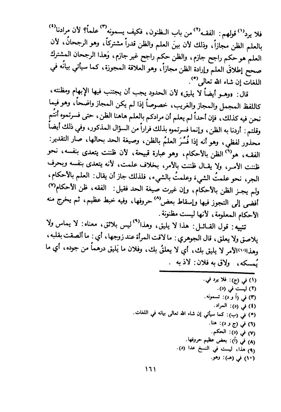 قَالَ: «وَهُوَ أَيْضًا لَا يَلِيقُ» لِأَنَّ الْحُدُودَ يَجِبُ أَنْ يُجْتَنَبَ فِيهَا الْإِبْهَامُ وَمَظِنَّتُهُ، كَاللَّفْظِ الْمُجْمَلِ وَالْمَجَازِ وَالْغَرِيبِ، خُصُوصًا إِذَا لَمْ يَكُنِ الْمَجَازُ وَاضِحًا، وَهُوَ فِيمَا نَحْنُ فِيهِ كَذَلِكَ، فَإِنَّ أَحَدًا لَمْ يَعْلَمْ أَنَّ مُرَادَكُمْ بِالْعِلْمِ هَاهُنَا الظَّنُّ، حَتَّى فَسَّرْتُمُوهُ أَنْتُمْ وَقُلْتُمْ: أَرَدْنَا بِهِ الظَّنَّ، وَإِنَّمَا فَسَّرْتُمُوهُ بِذَلِكَ فِرَارًا مِنَ السُّؤَالِ الْمَذْكُورِ، وَفِي ذَلِكَ أَيْضًا مَحْذُورٌ لَفْظِيٌّ، وَهُوَ أَنَّهُ إِذَا فُسِّرَ الْعِلْمُ بِالظَّنِّ، وَصِيغَةُ الْحَدِّ بِحَالِهَا، صَارَ التَّقْدِيرُ: الْفِقْهُ، هُوَ الظَّنُّ بِالْأَحْكَامِ، وَهُوَ عِبَارَةٌ قَبِيحَةٌ، لِأَنَّ ظَنَنْتَ يَتَعَدَّى بِنَفْسِهِ، نَحْوُ ظَنَنْتُ الْأَمْرَ، وَلَا يُقَالُ ظَنَنْتُ بِالْأَمْرِ، بِخِلَافِ عَلِمْتُ، لِأَنَّهُ يَتَعَدَّى بِنَفْسِهِ وَبِحَرْفِ الْجَرِّ، نَحْوُ عَلِمْتُ الشَّيْءَ وَعَلِمْتُ بِالشَّيْءِ، فَلِذَلِكَ جَازَ أَنْ يُقَالَ: الْعِلْمُ بِالْأَحْكَامِ، وَلَمْ يَجُزِ الظَّنُّ بِالْأَحْكَامِ، وَإِنْ غُيِّرَتْ صِيغَةُ الْحَدِّ فَقِيلَ: الْفِقْهُ، ظَنُّ الْأَحْكَامِ، أَفْضَى إِلَى التَّجَوُّزِ فِيهَا وَإِسْقَاطِ بَعْضِ حُرُوفِهَا، وَفِيهِ خَبْطٌ عَظِيمٌ، ثُمَّ يَخْرُجُ مِنْهُ الْأَحْكَامُ الْمَعْلُومَةُ ; لِأَنَّهَا لَيْسَتْ مَظْنُونَةً.