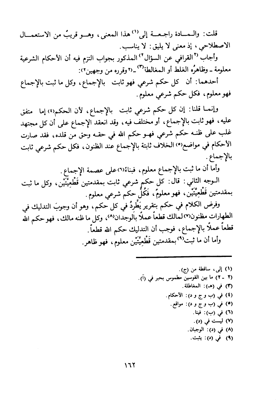 وَأَجَابَ الْقَرَافِيُّ عَنِ السُّؤَالِ الْمَذْكُورِ بِجَوَابٍ الْتَزَمَ فِيهِ أَنَّ الْأَحْكَامَ الشَّرْعِيَّةَ مَعْلُومَةٌ - وَظَاهِرُهُ الْغَلَطُ أَوِ الْمُغَالَطَةُ - وَقَرَّرَهُ مِنْ وَجْهَيْنِ: