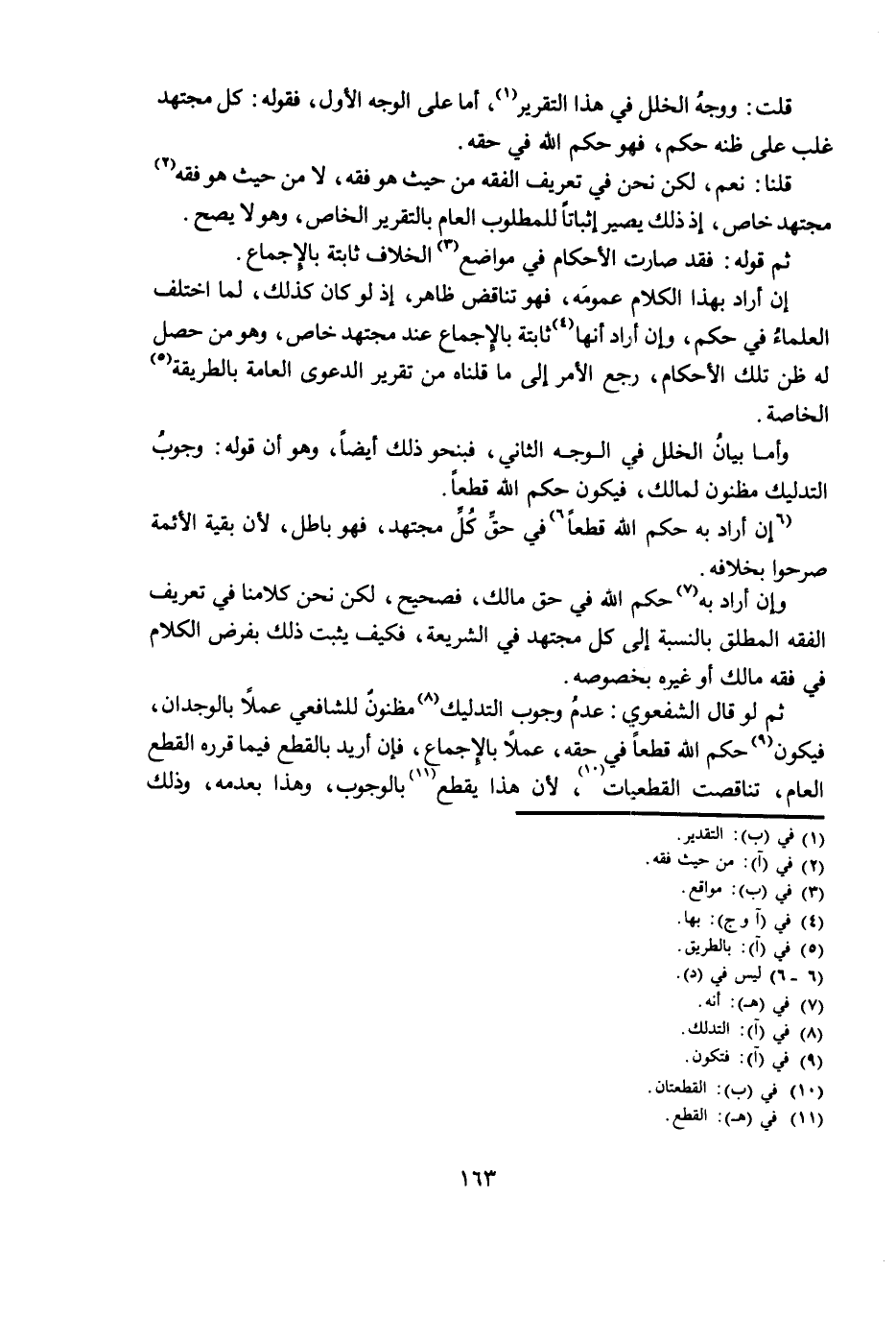 قُلْتُ: وَوَجْهُ الْخَلَلِ فِي هَذَا التَّقْرِيرِ، أَمَّا عَلَى الْوَجْهِ الْأَوَّلِ، فَقَوْلُهُ: كُلُّ مُجْتَهِدٍ غَلَبَ عَلَى ظَنِّهِ حُكْمٌ، فَهُوَ حُكْمُ اللَّهِ فِي حَقِّهِ.