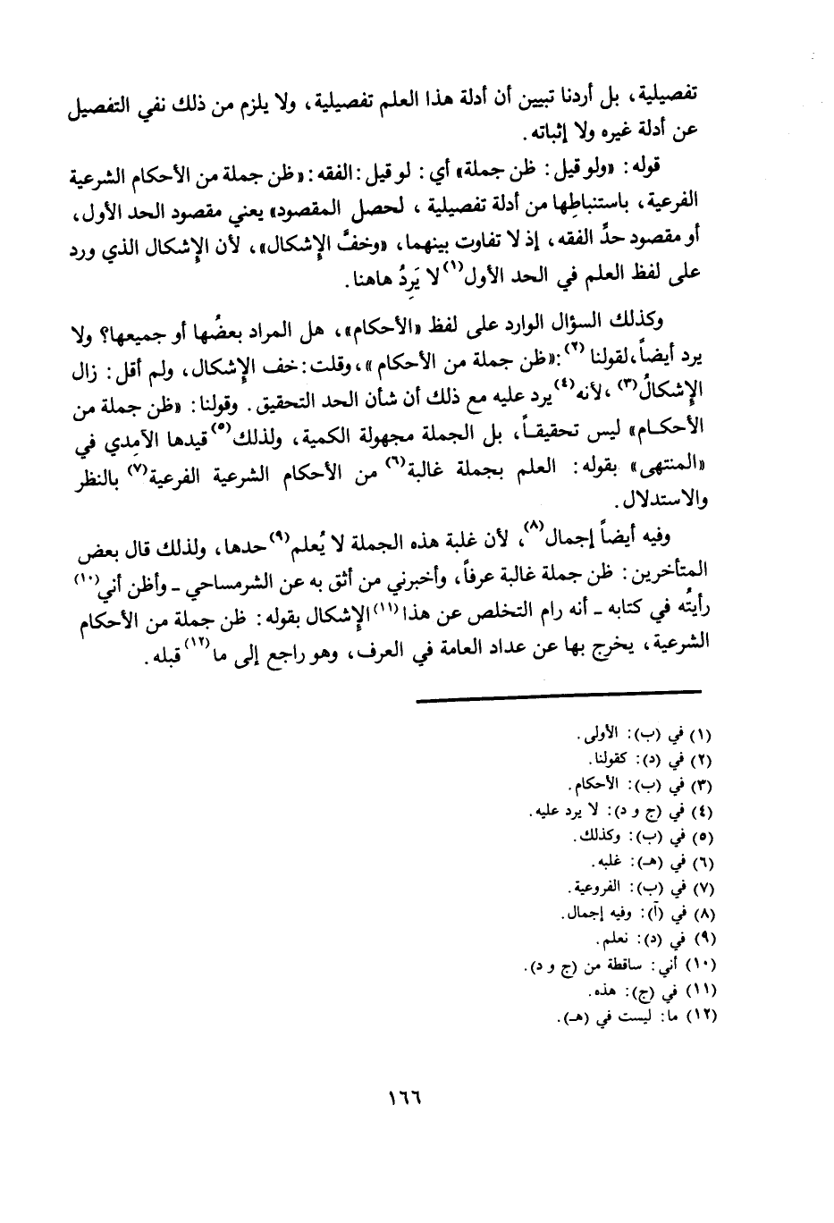 وَكَذَلِكَ السُّؤَالُ الْوَارِدُ عَلَى لَفْظِ «الْأَحْكَامِ» ، هَلِ الْمُرَادُ بَعْضُهَا أَوْ جَمِيعُهَا؟ وَلَا يَرِدُ أَيْضًا، لِقَوْلِنَا: «ظَنُّ جُمْلَةٍ مِنَ الْأَحْكَامِ» ، وَقُلْتُ: خَفَّ الْإِشْكَالُ، وَلَمْ أَقُلْ: زَالَ الْإِشْكَالُ، لِأَنَّهُ يُرَدُّ عَلَيْهِ مَعَ ذَلِكَ أَنَّ شَأْنَ الْحَدِّ التَّحْقِيقُ. وَقَوْلُنَا: «ظَنُّ جُمْلَةٍ مِنَ الْأَحْكَامِ» لَيْسَ تَحْقِيقًا، بَلِ الْجُمْلَةُ مَجْهُولَةُ الْكَمِّيَّةِ، وَلِذَلِكَ قَيَّدَهَا الْآمِدِيُّ فِي «الْمُنْتَهَى» بِقَوْلِهِ: الْعِلْمُ بِجُمْلَةٍ غَالِبَةٍ مِنَ الْأَحْكَامِ الشَّرْعِيَّةِ الْفَرْعِيَّةِ بِالنَّظَرِ وَالِاسْتِدْلَالِ.
