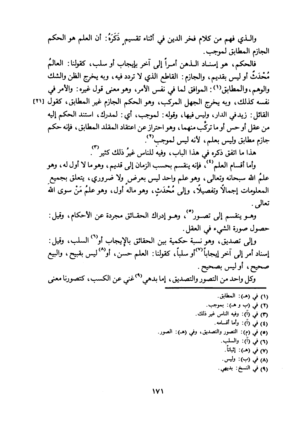 وَالَّذِي فُهِمَ مِنْ كَلَامِ فَخْرِ الدِّينِ فِي أَثْنَاءِ تَقْسِيمِ ذِكْرِهِ: أَنَّ الْعِلْمَ هُوَ الْحُكْمُ الْجَازِمُ الْمُطَابِقُ لِمُوجَبٍ.