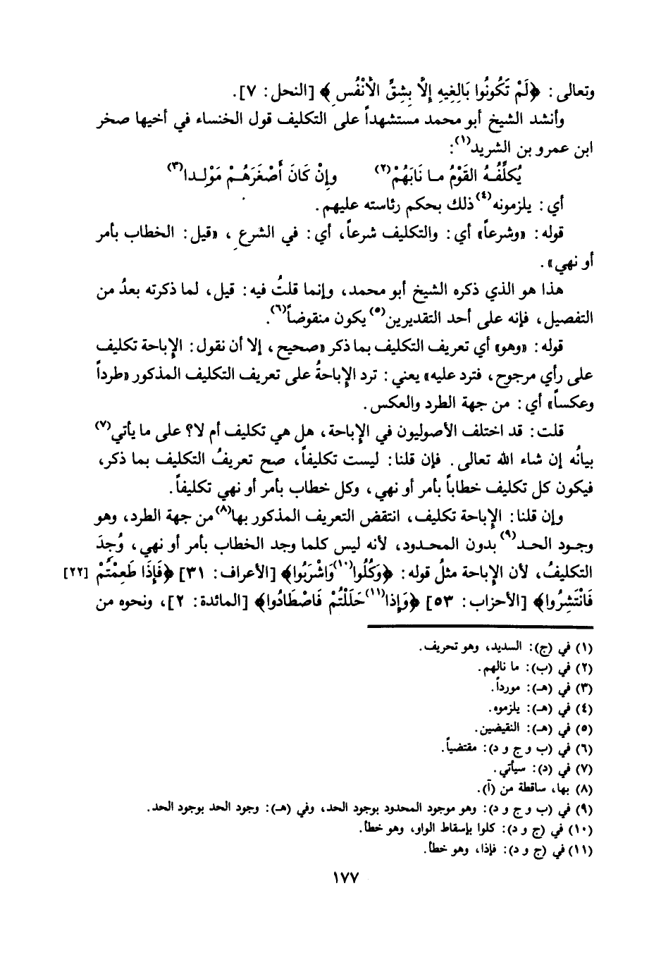 وَتَعَالَى: {لَمْ تَكُونُوا بَالِغِيهِ إِلَّا بِشِقِّ الْأَنْفُسِ} [النَّحْلِ: 7] . وَأَنْشَدَ الشَّيْخُ أَبُو مُحَمَّدٍ مُسْتَشْهِدًا عَلَى التَّكْلِيفِ قَوْلَ الْخَنْسَاءِ فِي أَخِيهَا صَخْرِ بْنِ عَمْرِو بْنِ الشَّرِيدِ: