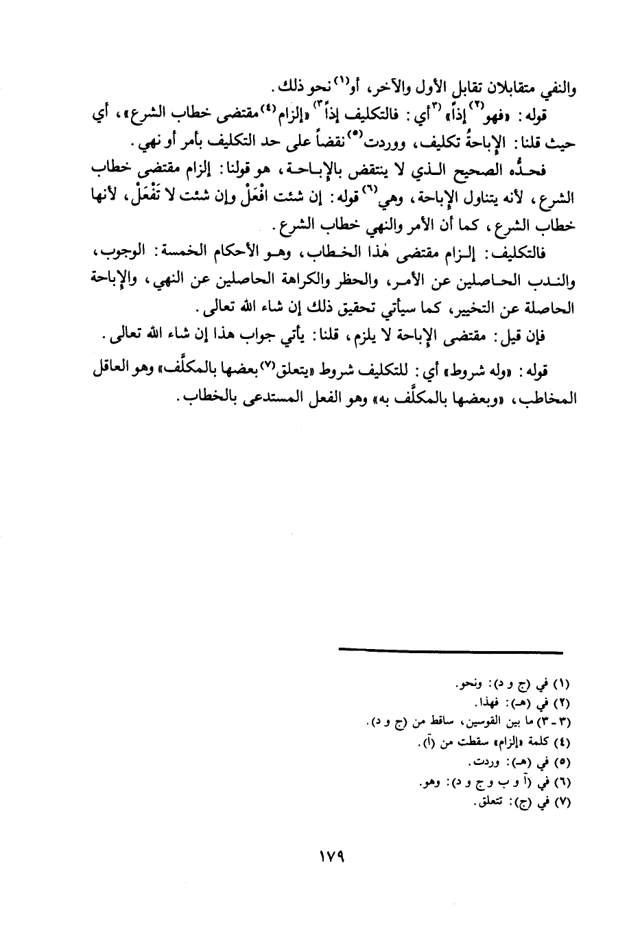 فَحَدُّهُ الصَّحِيحُ الَّذِي لَا يَنْتَقِضُ بِالْإِبَاحَةِ، هُوَ قَوْلُنَا: إِلْزَامُ مُقْتَضَى خِطَابِ الشَّرْعِ، لِأَنَّهُ يَتَنَاوَلُ الْإِبَاحَةَ، وَهِيَ قَوْلُهُ: إِنْ شِئْتَ افْعَلْ وَإِنْ شِئْتَ لَا تَفْعَلْ، لِأَنَّهَا خِطَابُ الشَّرْعِ، كَمَا أَنَّ الْأَمْرَ وَالنَّهْيَ خِطَابُ الشَّرْعِ.