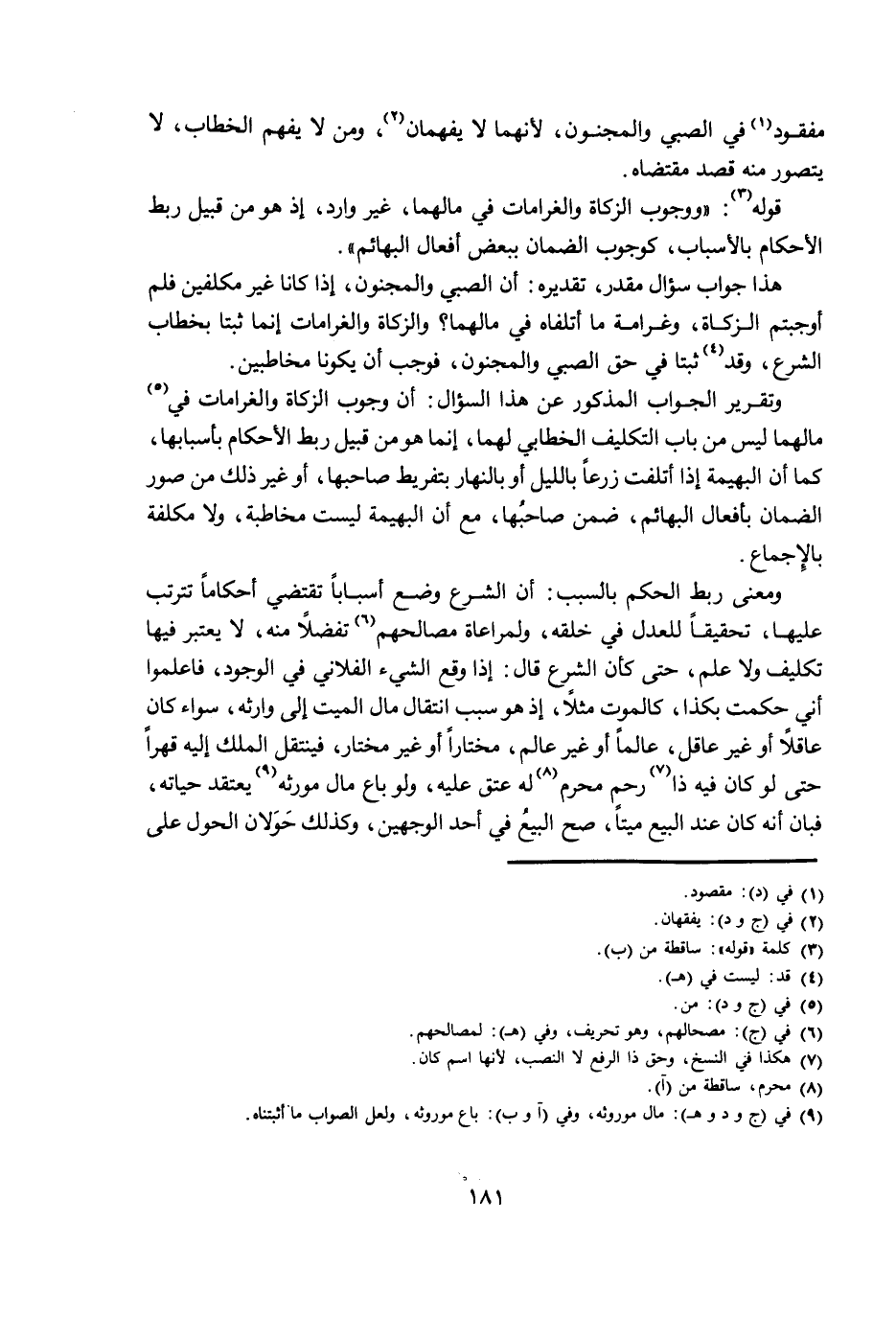 قَوْلُهُ: «وَوُجُوبُ الزَّكَاةِ وَالْغَرَامَاتِ فِي مَالِهِمَا، غَيْرُ وَارِدٍ، إِذْ هُوَ مِنْ قَبِيلِ رَبْطِ الْأَحْكَامِ بِالْأَسْبَابِ، كَوُجُوبِ الضَّمَانِ بِبَعْضِ أَفْعَالِ الْبَهَائِمِ» .