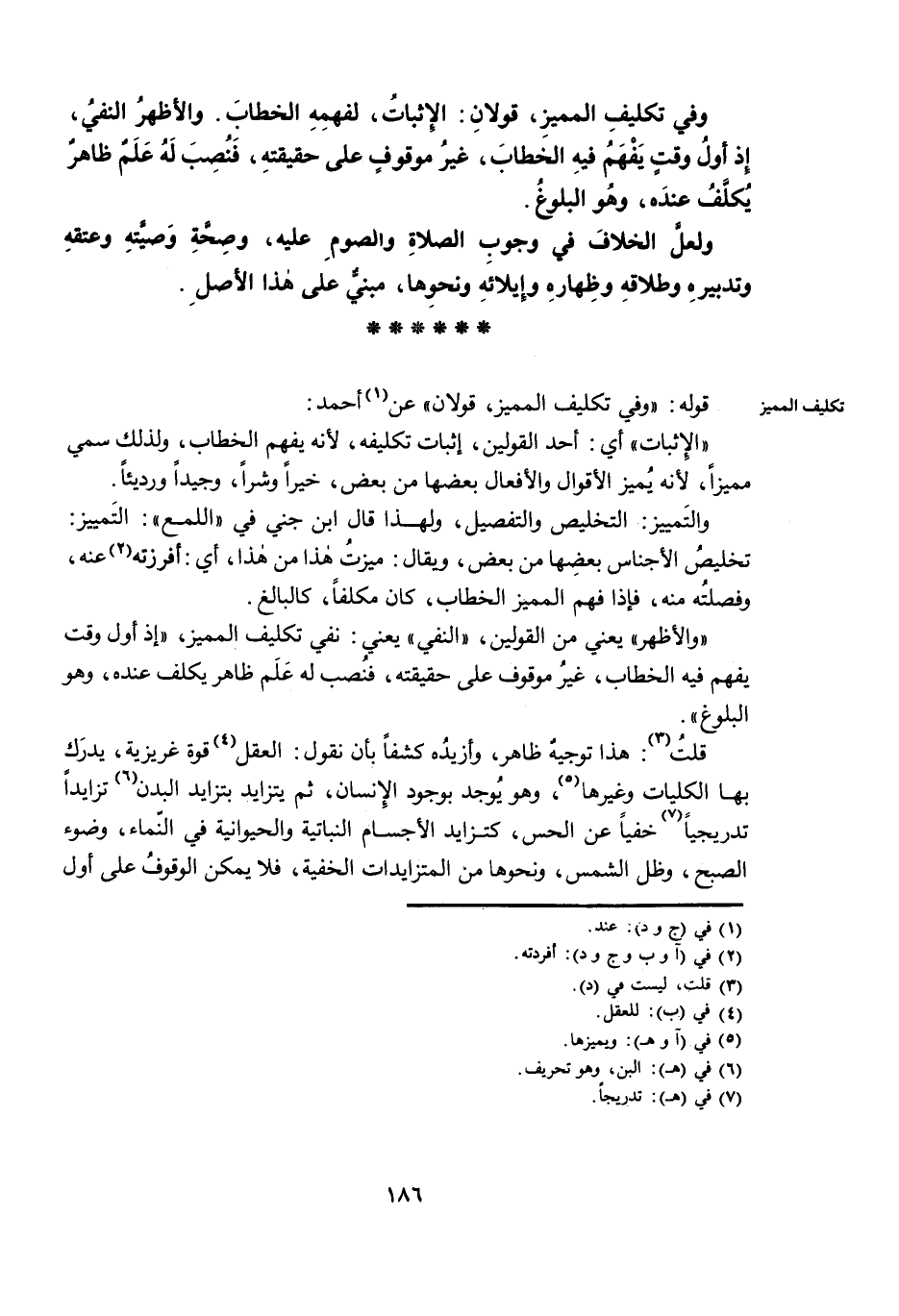 «وَالْأَظْهَرُ» يَعْنِي مِنَ الْقَوْلَيْنِ، «النَّفْيُ» يَعْنِي: نَفْيَ تَكْلِيفِ الْمُمَيِّزِ، «إِذْ أَوَّلُ وَقْتٍ يَفْهَمُ فِيهِ الْخِطَابَ، غَيْرُ مَوْقُوفٍ عَلَى حَقِيقَتِهِ، فَنُصِبَ لَهُ عَلَمٌ ظَاهِرٌ يُكَلَّفُ عِنْدَهُ، وَهُوَ الْبُلُوغُ» .