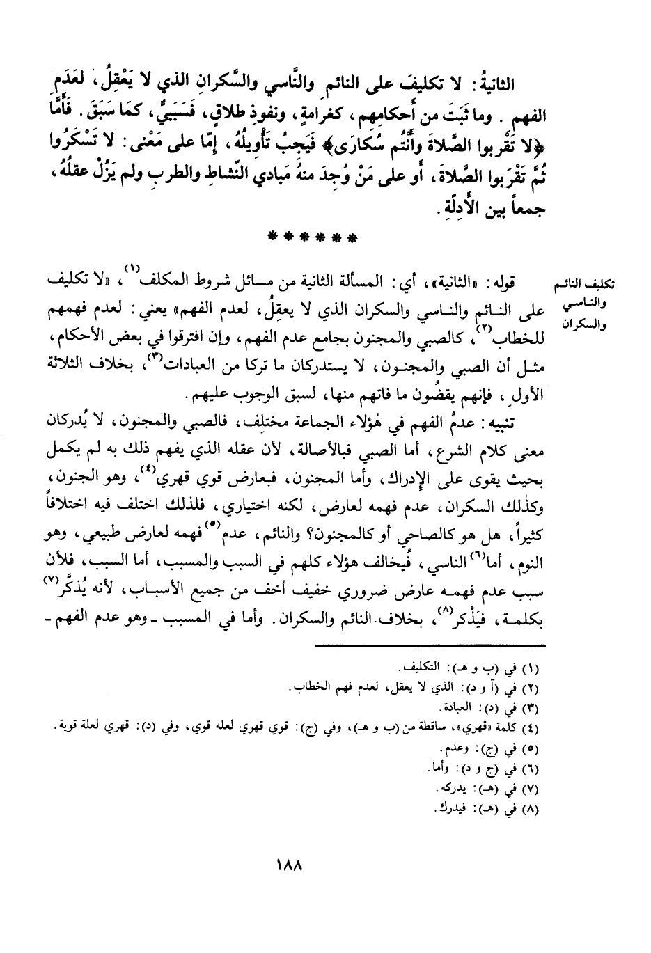 تَنْبِيهٌ: عَدَمُ الْفَهْمِ فِي هَؤُلَاءِ الْجَمَاعَةِ مُخْتَلِفٌ، فَالصَّبِيُّ وَالْمَجْنُونُ، لَا يُدْرِكَانِ مَعْنَى كَلَامِ الشَّرْعِ، أَمَّا الصَّبِيُّ فَبِالْأَصَالَةِ، لِأَنَّ عَقْلَهُ الَّذِي يَفْهَمُ ذَلِكَ بِهِ لَمْ يَكْمُلْ بِحَيْثُ يَقْوَى عَلَى الْإِدْرَاكِ، وَأَمَّا الْمَجْنُونُ، فَبِعَارِضٍ قَوِيٍّ قَهْرِيٍّ، وَهُوَ الْجُنُونُ، وَكَذَلِكَ السَّكْرَانُ، عَدَمُ فَهْمِهِ لِعَارِضٍ، لَكِنَّهُ اخْتِيَارِيٌّ، فَلِذَلِكَ اخْتُلِفَ فِيهِ اخْتِلَافًا كَثِيرًا، هَلْ هُوَ كَالصَّاحِي أَوْ كَالْمَجْنُونِ؟ وَالنَّائِمُ، عَدَمُ فَهْمِهِ لِعَارِضٍ طَبِيعِيٍّ، وَهُوَ النَّوْمُ، أَمَّا النَّاسِي، فَيُخَالِفُ هَؤُلَاءِ كُلَّهُمْ فِي السَّبَبِ وَالْمُسَبَّبِ، أَمَّا السَّبَبُ، فَلِأَنَّ سَبَبَ عَدَمِ فَهْمِهِ عَارِضٌ ضَرُورِيٌّ خَفِيفٌ أَخَفُّ مِنْ جَمِيعِ الْأَسْبَابِ، لِأَنَّهُ يُذَكَّرُ بِكَلِمَةٍ، فَيَذَّكَّرُ، بِخِلَافِ النَّائِمِ وَالسَّكْرَانِ. وَأَمَّا فِي الْمُسَبَّبِ - وَهُوَ عَدَمُ الْفَهْمِ -