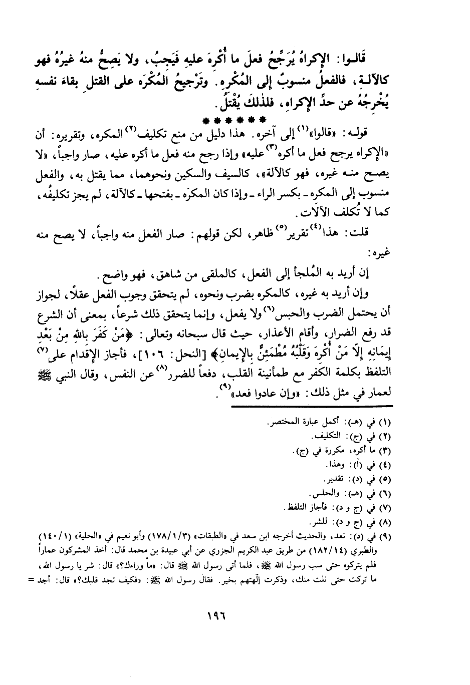 وَإِنْ أُرِيدَ بِهِ غَيْرُهُ، كَالْمُكْرَهِ بِضَرْبٍ وَنَحْوِهِ، لَمْ يَتَحَقَّقْ وُجُوبُ الْفِعْلِ عَقْلًا، لِجَوَازِ أَنْ يَحْتَمِلَ الضَّرْبَ وَالْحَبْسَ وَلَا يَفْعَلَ، وَإِنَّمَا يَتَحَقَّقُ ذَلِكَ شَرْعًا، بِمَعْنَى أَنَّ الشَّرْعَ قَدْ رَفَعَ الضِّرَارَ، وَأَقَامَ الْأَعْذَارَ، حَيْثُ قَالَ سُبْحَانَهُ وَتَعَالَى: {مَنْ كَفَرَ بِاللَّهِ مِنْ بَعْدِ إِيمَانِهِ إِلَّا مَنْ أُكْرِهَ وَقَلْبُهُ مُطْمَئِنٌّ بِالْإِيمَانِ} [النَّحْلِ: 106] ، فَأَجَازَ الْإِقْدَامَ عَلَى التَّلَفُّظِ بِكَلِمَةِ الْكُفْرِ مَعَ طُمَأْنِينَةِ الْقَلْبِ، دَفْعًا لِلضَّرَرِ عَنِ النَّفْسِ، وَقَالَ النَّبِيُّ صَلَّى اللَّهُ عَلَيْهِ وَسَلَّمَ لِعَمَّارٍ فِي مِثْلِ ذَلِكَ: «وَإِنْ عَادُوا فَعُدْ» .