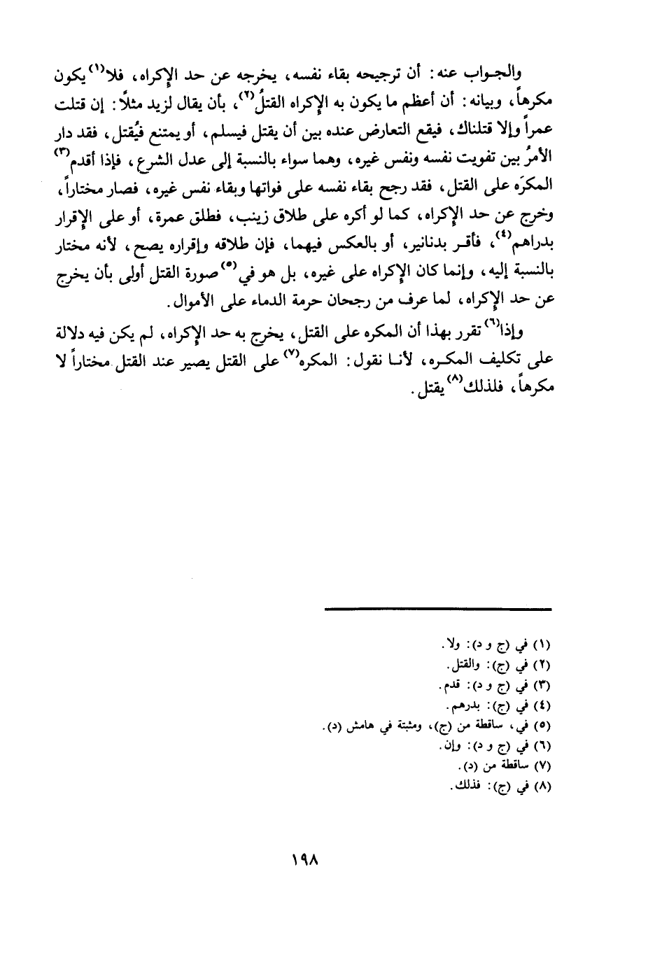 وَالْجَوَابُ عَنْهُ: أَنَّ تَرْجِيحَهُ بَقَاءُ نَفْسِهِ، يُخْرِجُهُ عَنْ حَدِّ الْإِكْرَاهِ، فَلَا يَكُونُ مُكْرَهًا، وَبَيَانُهُ: أَنَّ أَعْظَمَ مَا يَكُونُ بِهِ الْإِكْرَاهُ الْقَتْلُ، بِأَنْ يُقَالَ لِزَيْدٍ مَثَلًا: إِنْ قَتَلْتَ عَمْرًا وَإِلَّا قَتَلْنَاكَ، فَيَقَعُ التَّعَارُضُ عِنْدَهُ بَيْنَ أَنْ يَقْتُلَ فَيَسْلَمَ، أَوْ يَمْتَنِعَ فَيُقْتَلُ، فَقَدْ دَارَ الْأَمْرُ بَيْنَ تَفْوِيتِ نَفْسِهِ وَنَفْسِ غَيْرِهِ، وَهُمَا سَوَاءٌ بِالنِّسْبَةِ إِلَى عَدْلِ الشَّرْعِ، فَإِذَا أَقْدَمَ الْمُكْرَهُ عَلَى الْقَتْلِ، فَقَدْ رَجَّحَ بَقَاءَ نَفْسِهِ عَلَى فَوَاتِهَا وَبَقَاءَ نَفْسِ غَيْرِهِ، فَصَارَ مُخْتَارًا، وَخَرَجَ عَنْ حَدِّ الْإِكْرَاهِ، كَمَا لَوْ أُكْرِهَ عَلَى طَلَاقِ زَيْنَبَ، فَطَلَّقَ عَمْرَةَ، أَوْ عَلَى الْإِقْرَارِ بِدَرَاهِمَ، فَأَقَرَّ بِدَنَانِيرَ، أَوْ بِالْعَكْسِ فِيهِمَا، فَإِنَّ طَلَاقَهُ وَإِقْرَارَهُ يَصِحُّ، لِأَنَّهُ مُخْتَارٌ بِالنِّسْبَةِ إِلَيْهِ، وَإِنَّمَا كَانَ الْإِكْرَاهُ عَلَى غَيْرِهِ، بَلْ هُوَ فِي صُورَةِ الْقَتْلِ أَوْلَى بِأَنْ يَخْرُجَ عَنْ حَدِّ الْإِكْرَاهِ، لِمَا عُرِفَ مِنْ رُجْحَانِ حُرْمَةِ الدِّمَاءِ عَلَى الْأَمْوَالِ.